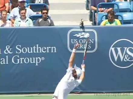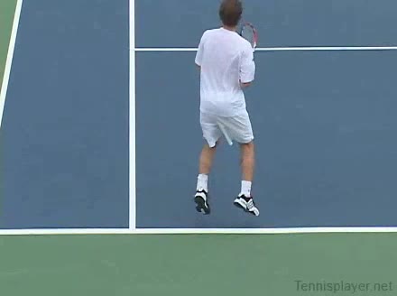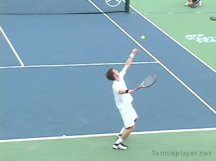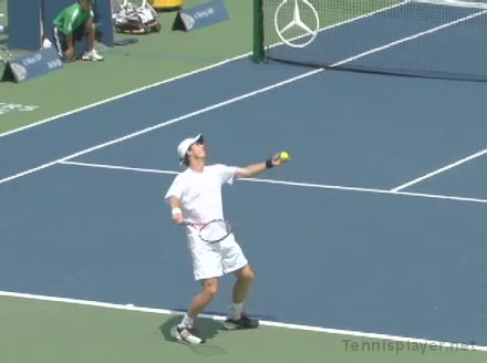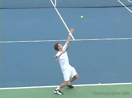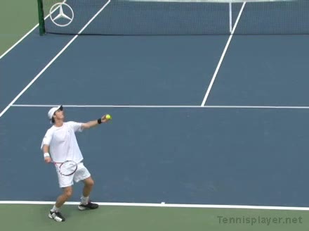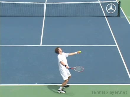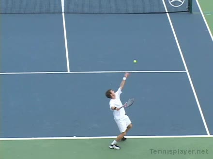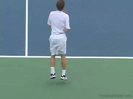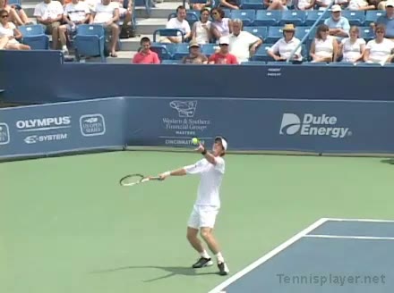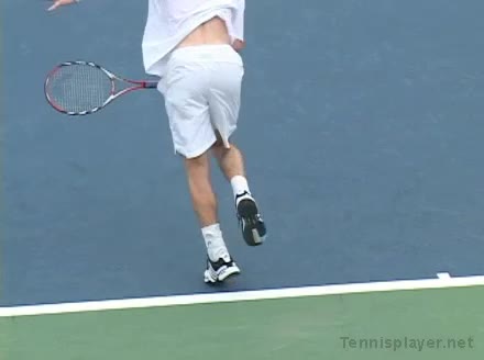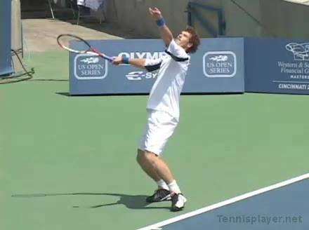 Andy Murray's forehand approach shot into an overhead from the middle of the court, filmed from the side. From this angle, you can see his shoulders and trunk coil early on the forehand approach, then uncoil in sequence into the overhead with a pronounced upward trunk extension and shoulder-over-shoulder action.