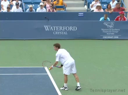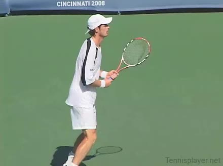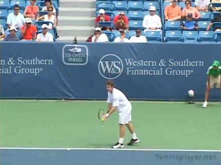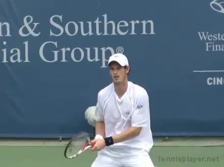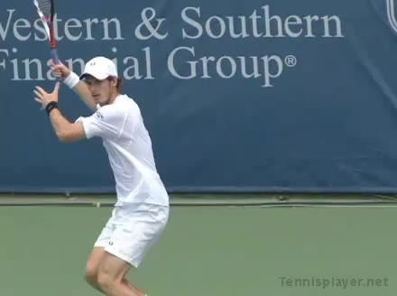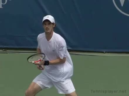 Andy Murray's backhand slice from the middle of the court, filmed from the side. His shoulders turn early to load the trunk, then the uncoiling of his torso into contact stays gradual with the chest remaining slightly closed well through the swing.