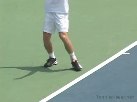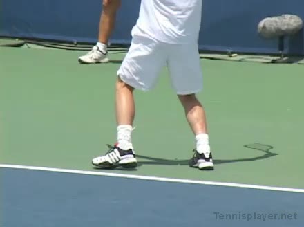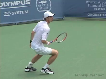 Andy Murray's forehand approach shot from a central position, filmed from the front. His footwork features a quick adjustment shuffle into the ball before planting in a semi-open stance, followed by immediate small recovery steps moving forward to the net.