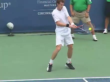 Andy Murray's running backhand slice from the baseline, filmed from the side. His shoulders close significantly as he coils the trunk on the preparation step, then uncoil in a measured sequence with the torso staying slightly open at contact to stabilize the slicing motion.