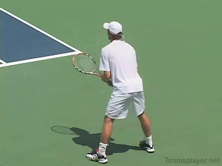 Andy Murray's backhand slice from a wide position, filmed from a rear angle. His shoulders turn early as his trunk coils against the direction of movement, then uncoils in sync with his forward step, keeping the hitting shoulder slightly higher to support the low, skidding slice.