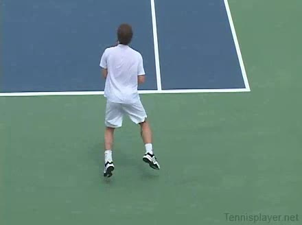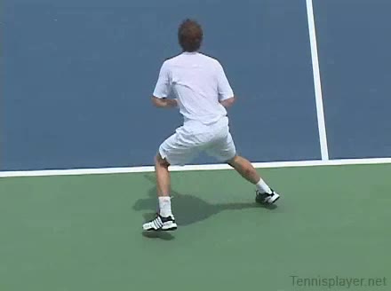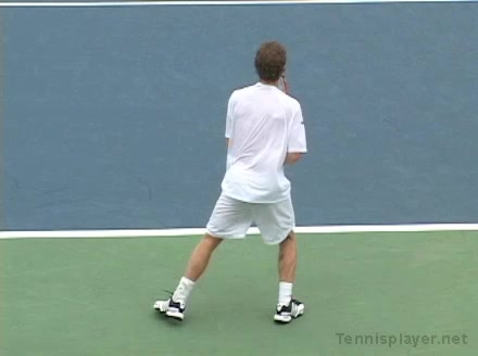 Andy Murray's forehand slice from the center baseline, hitting a wide ball, filmed from a rear angle. His footwork includes a small adjustment hop into a semi-open stance followed by a controlled lateral recovery step back toward the middle after contact.