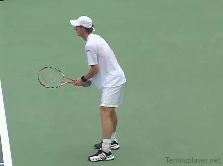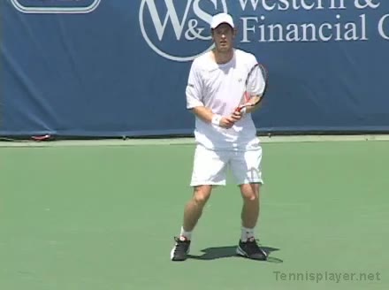 Andy Murray's backhand half-volley from the center of the court, filmed from a front angle. His shoulders and trunk stay relatively square to the net with a compact coil, then subtly uncoil through contact, showing minimal upper-body rotation as he stabilizes against the incoming pace.