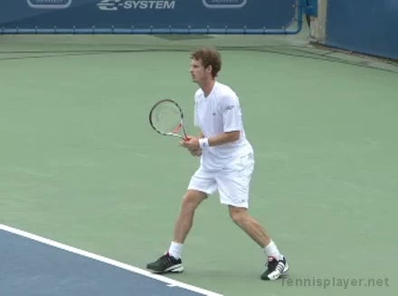 Andy Murray's backhand slice from the middle of the court, filmed from the side. His follow-through finishes with the racket hand extended forward while his weight transfers onto his front leg, bringing him quickly back toward a compact ready position.