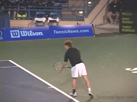 Andy Murray's wide backhand down the line from the baseline, filmed from a court-level front angle. His hips stay relatively closed with a pronounced knee bend on the outside leg, driving up through the legs to recover quickly back toward the center.