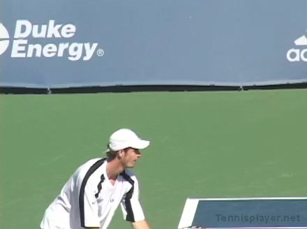 Andy Murray's backhand slice from the deuce side, filmed from the side. After contact he extends the racquet forward with a low, elongated follow-through while his weight continues to move toward the sideline before he squares up into a neutral ready position.