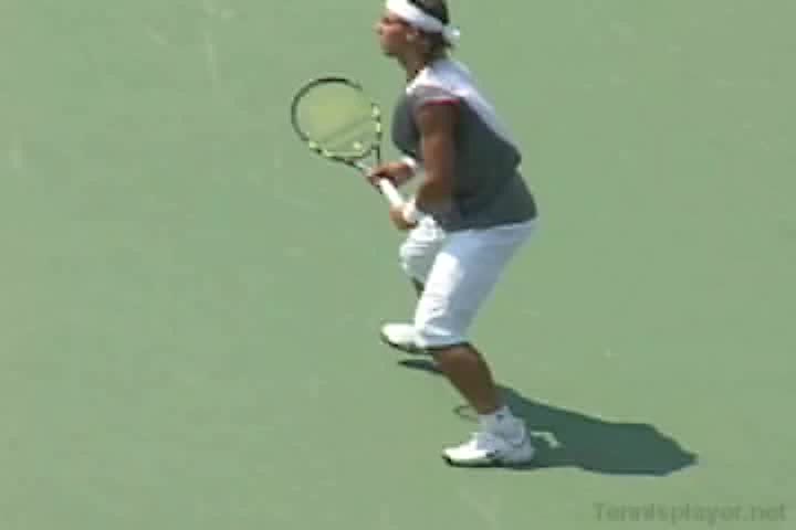 Nadal's forehand from the center of the court, filmed from a side angle animation. His footwork pattern includes a pronounced load on the outside leg into an open stance, followed by a quick recovery step that readies him for the next ball.