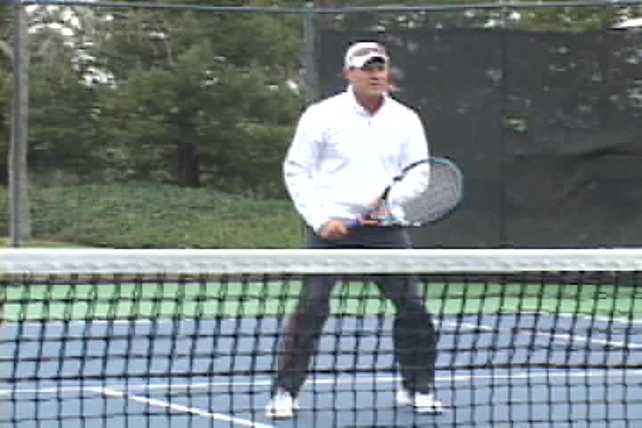 Brent Abel’s forehand and backhand volleys from mid-court, filmed from a front court-level angle. After contact he keeps the racquet head slightly above his hand with a compact finish and quickly resets his feet into a neutral ready position in front of the net.