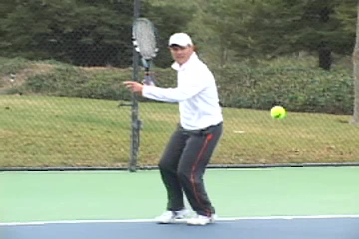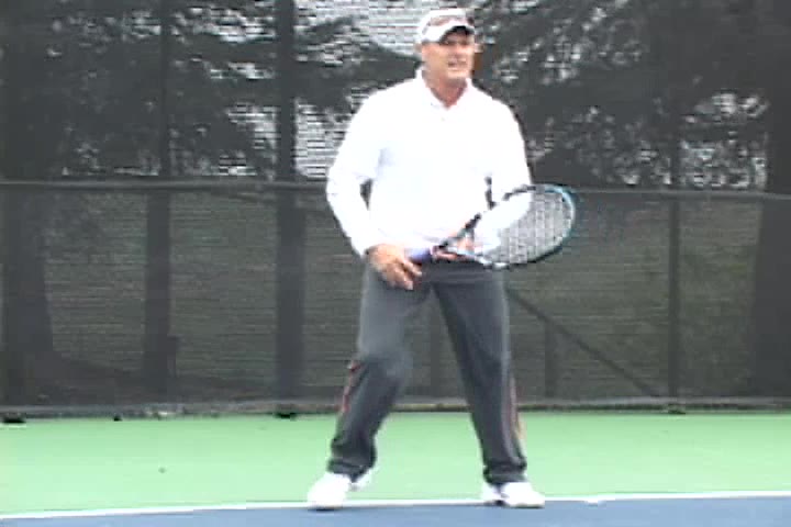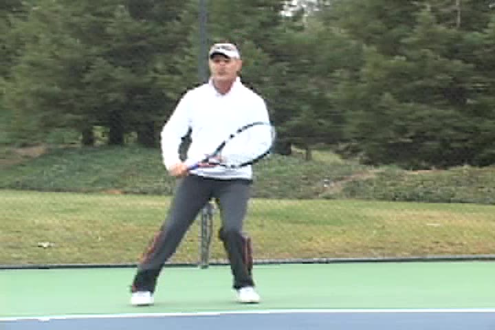 Brent Abel’s approach shot from the center of the court, filmed from a teaching animation angle. His footwork pattern emphasizes a small adjustment step into a balanced, slightly closed stance just before contact to set up for moving forward to the net.