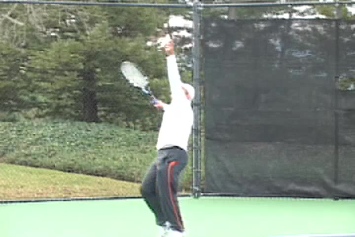 Brent Abel's overhead from the center of the court, filmed from a court-level front angle. His continental grip is easy to see, with the wrist laid back in a classic throwing position before snapping up and through the contact.