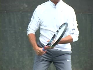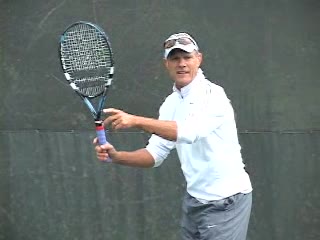 Brent Abel’s animation of hand positions on the racquet, filmed from a front instructional angle. The follow-through is illustrated by the non-hitting hand releasing and then rejoining the racquet to emphasize how the player recovers back to a neutral ready position.