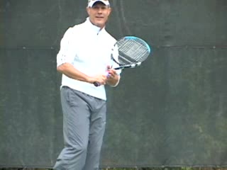 Brent Abel's drop shot from the center of the court, filmed from a front teaching angle. His follow-through stays compact with the racquet hand finishing in front of the body as he quickly recovers forward, bringing the non-hitting hand up and ready for the next ball.