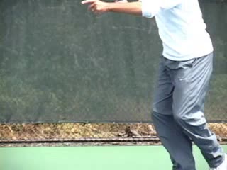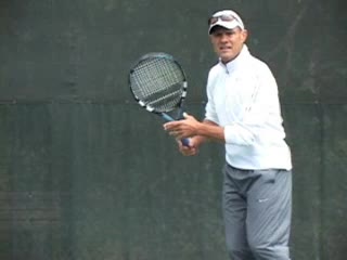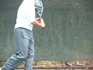 Brent Abel's easy volley from the net area, filmed from a court-level front angle. His shoulders stay relatively quiet while the trunk makes a compact coil and uncoil, clearly linking the shoulder line to the forward step for a simple kinetic chain into the volley.