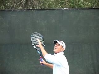 Brent Abel plays a full singles point from a central baseline position, filmed from a high rear court-level angle. The video makes it easy to see his continental grip on volleys and overheads, along with a relaxed wrist that firms up only at contact.