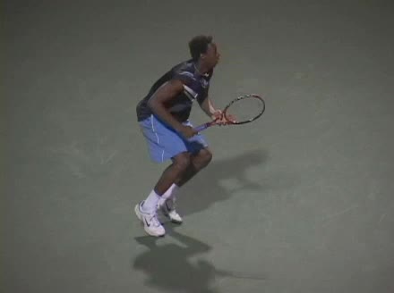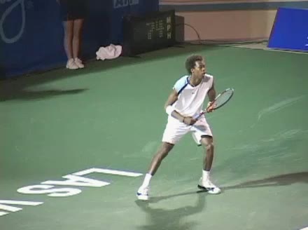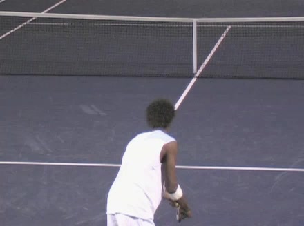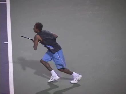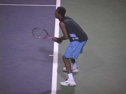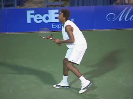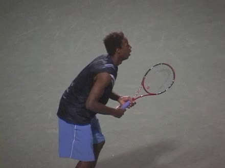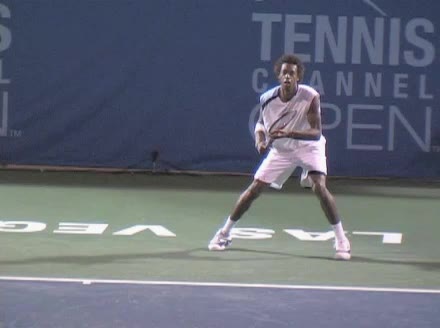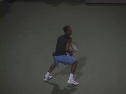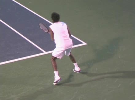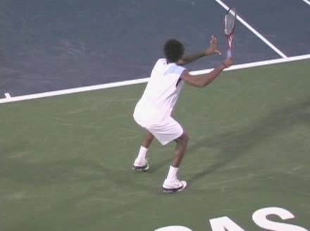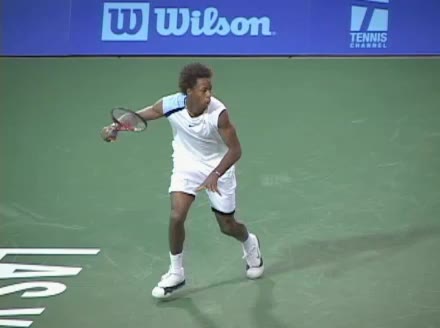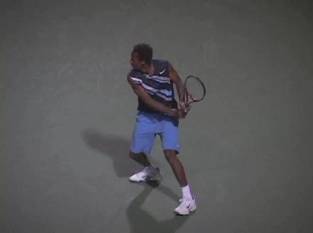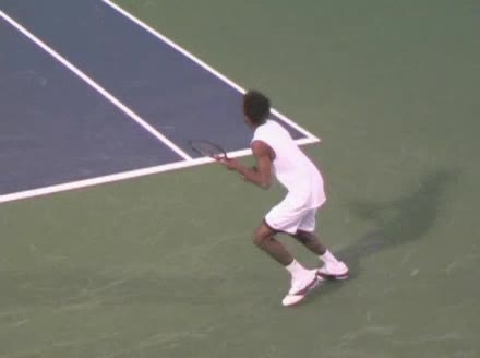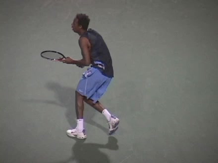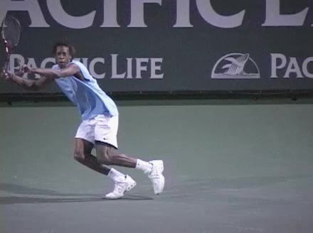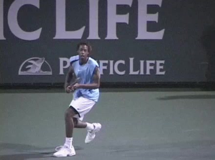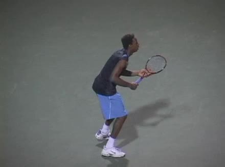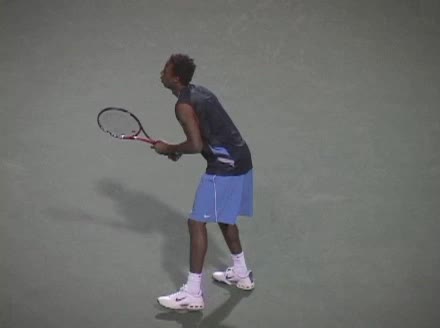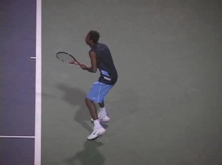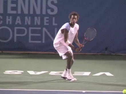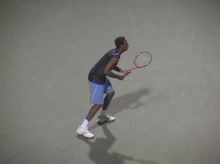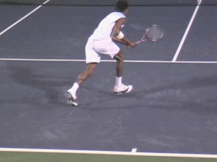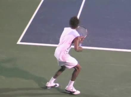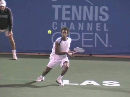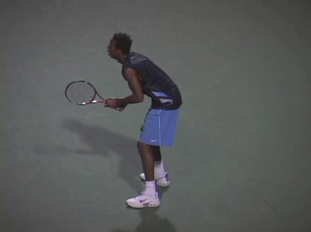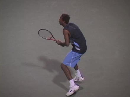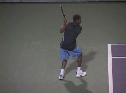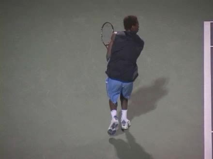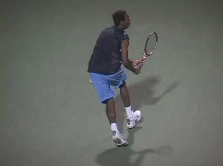 Gael Monfils's forehand approach shot to a backhand volley from the center of the court, filmed from a rear angle. His semi-western forehand grip sets a strong wrist lag on the forward swing, with the wrist uncoiling into contact while staying relatively firm through the hitting zone.