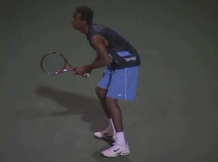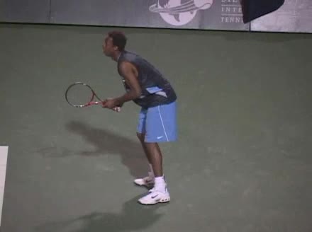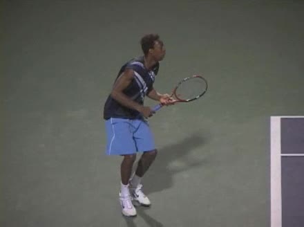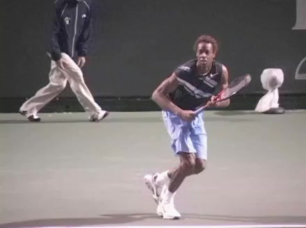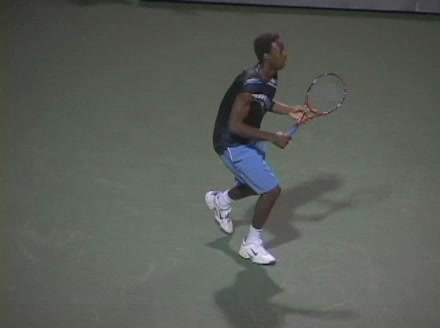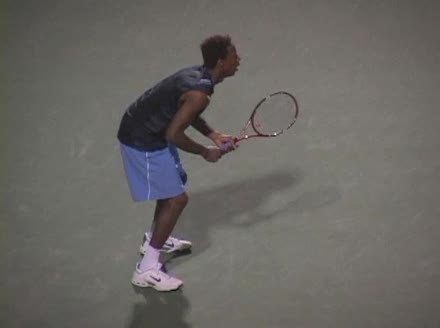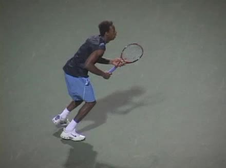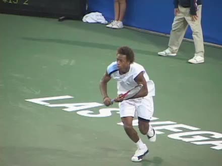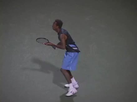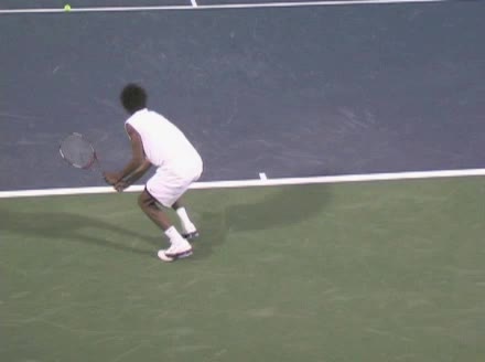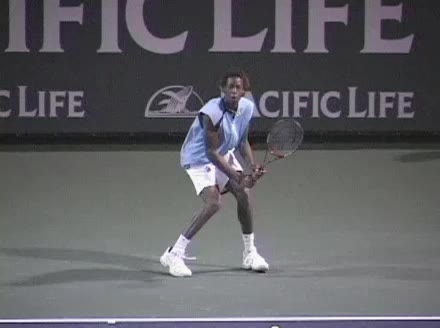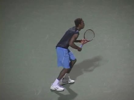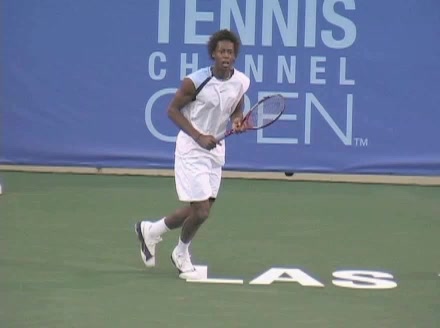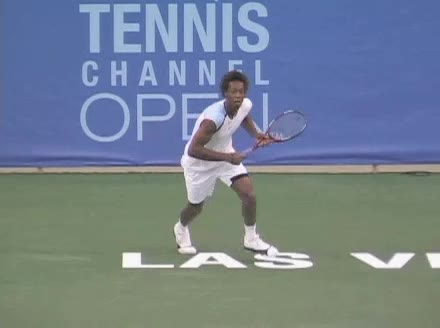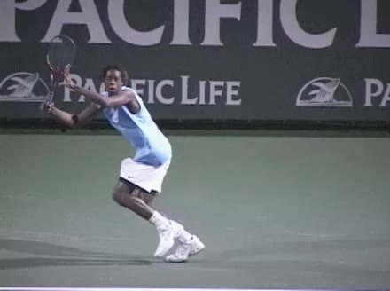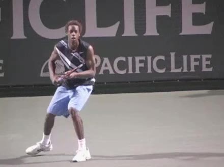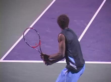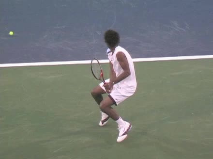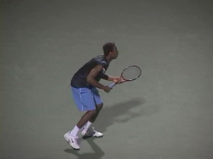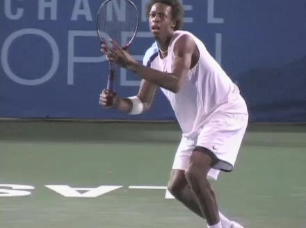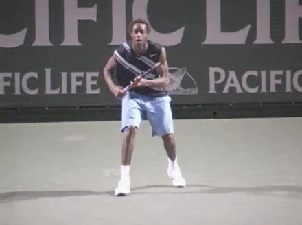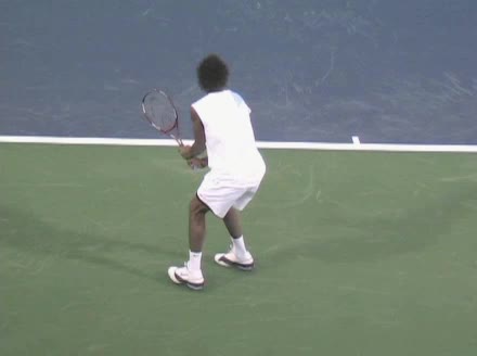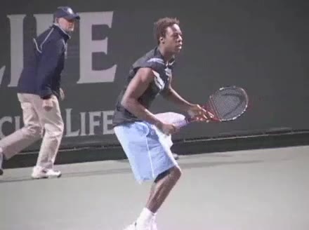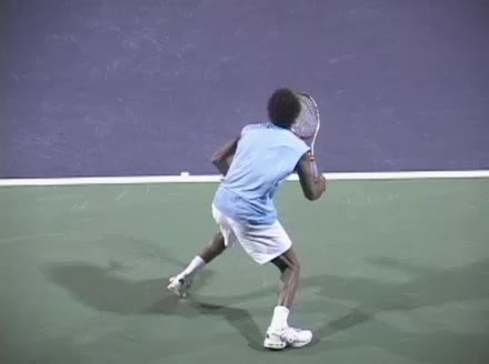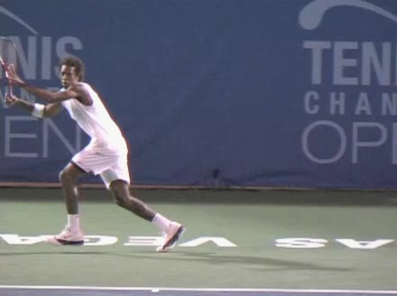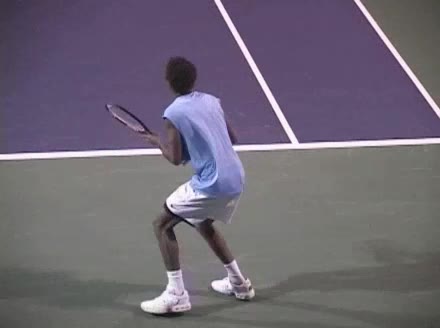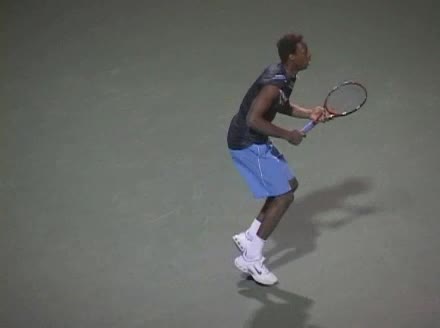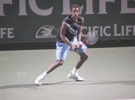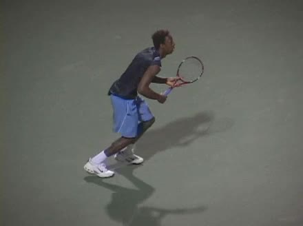 Gael Monfils's forehand approach shot to a backhand volley from the center of the court, filmed from a rear angle. His semi-western forehand grip sets a strong wrist lag on the forward swing, with the wrist uncoiling into contact while staying relatively firm through the hitting zone.
