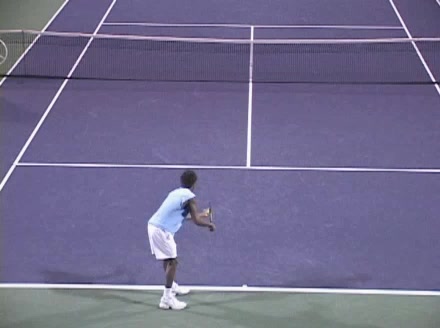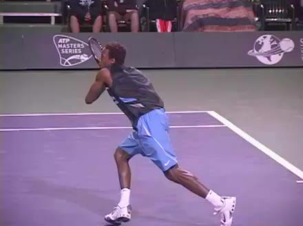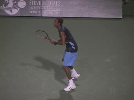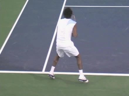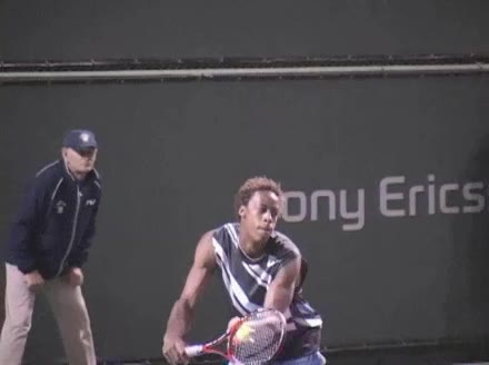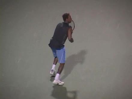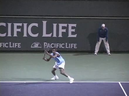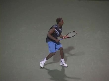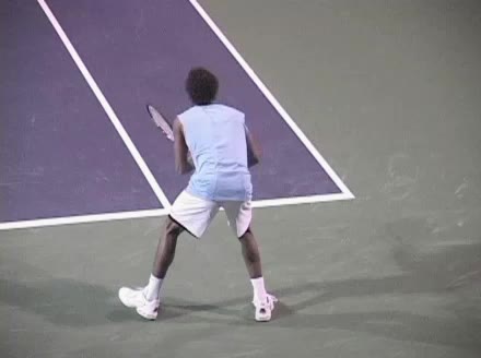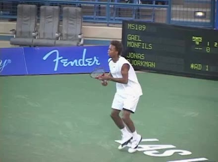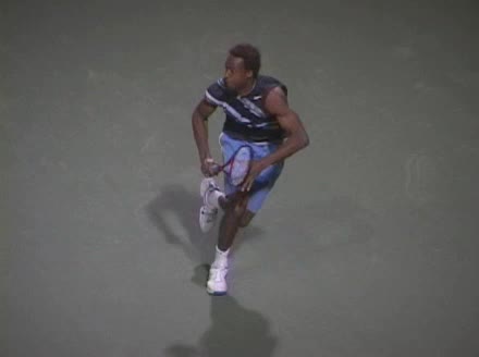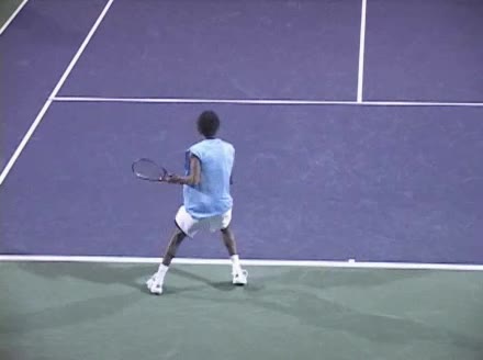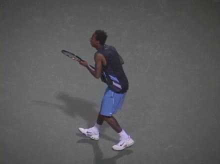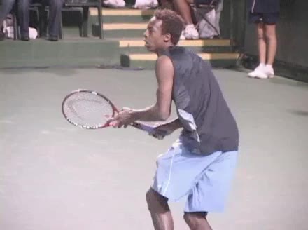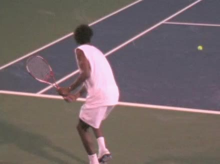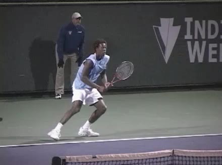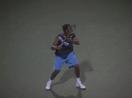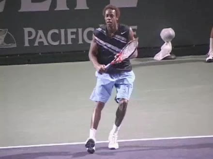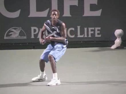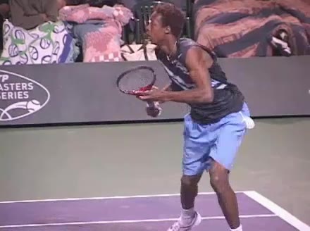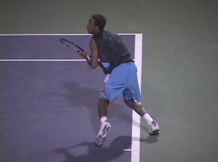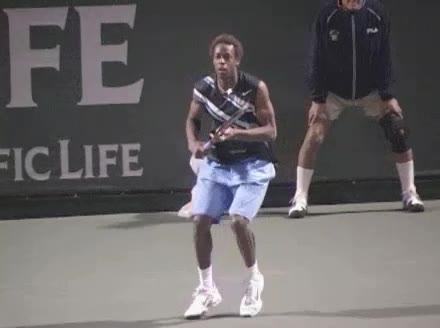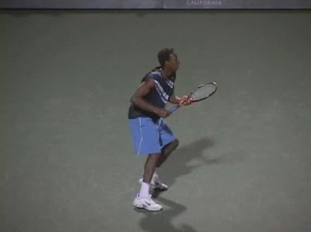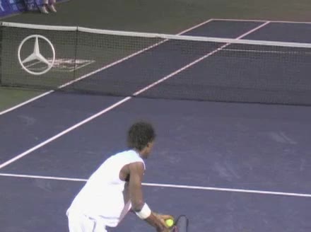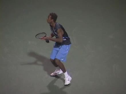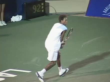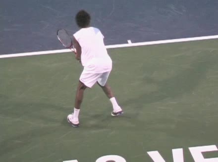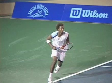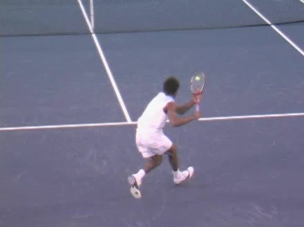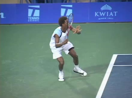 Gael Monfils's forehand approach shot to a backhand volley from the center of the court, filmed from a rear angle. His semi-western forehand grip sets a strong wrist lag on the forward swing, with the wrist uncoiling into contact while staying relatively firm through the hitting zone.