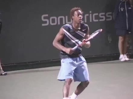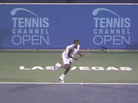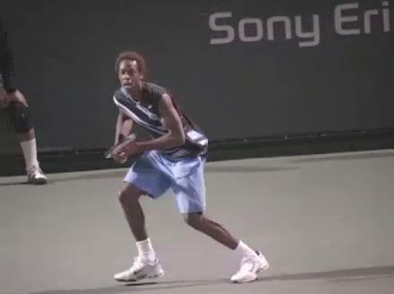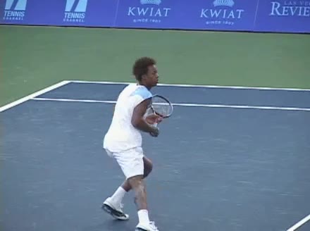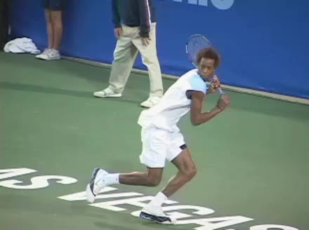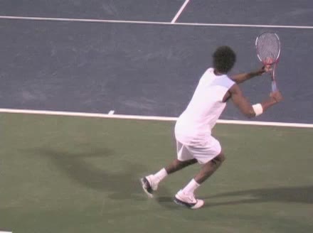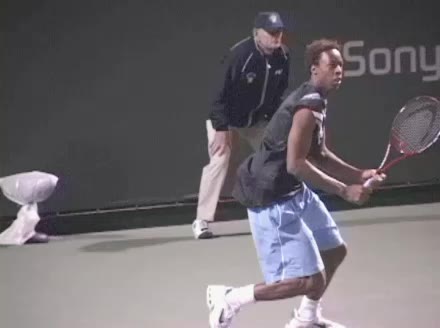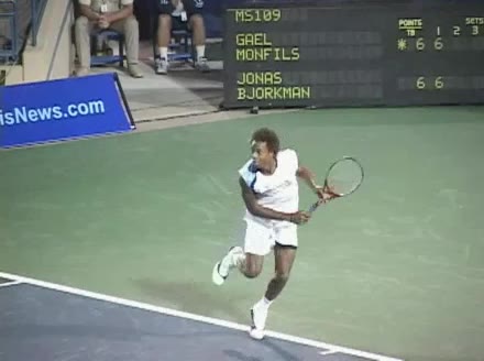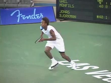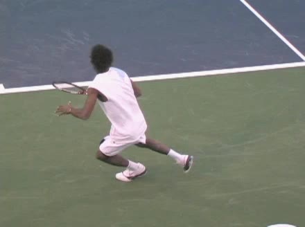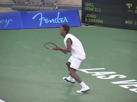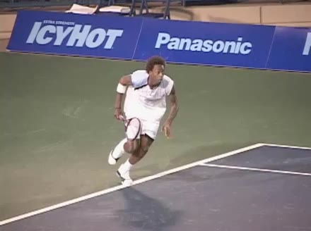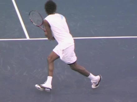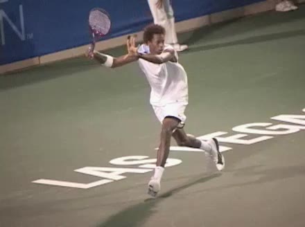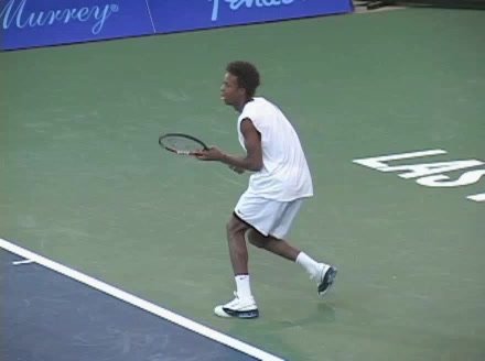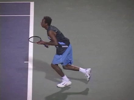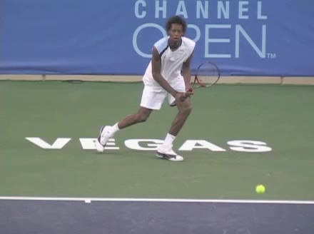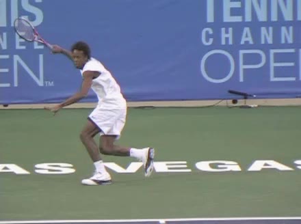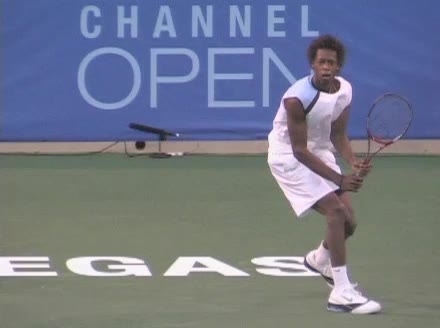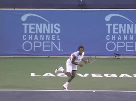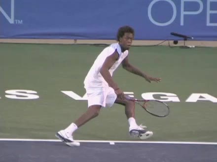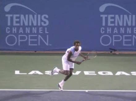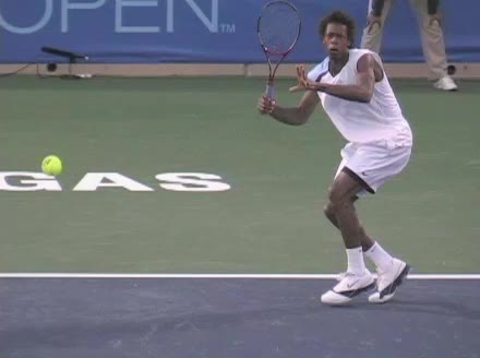Gael Monfils's running forehand slice from the deuce side, filmed from the side. His shoulders rotate early as he sprints, then his trunk stays relatively closed through contact with a late uncoil that lets the non-dominant arm counter-rotate and stabilize the upper body.