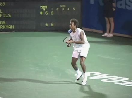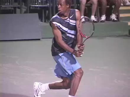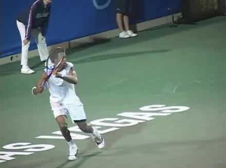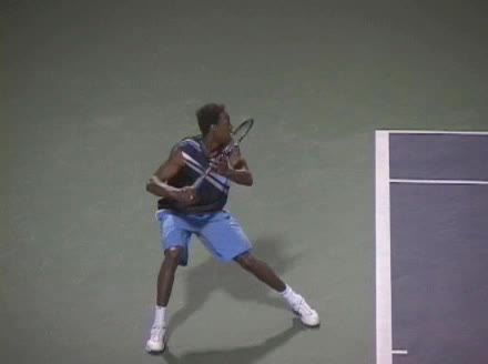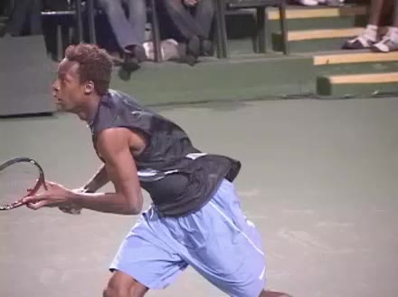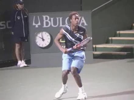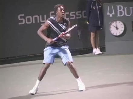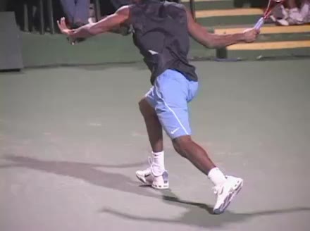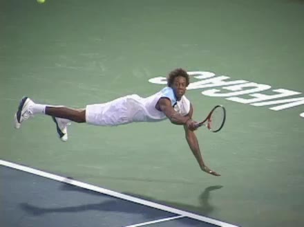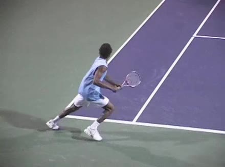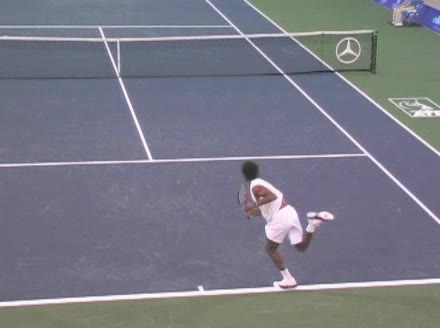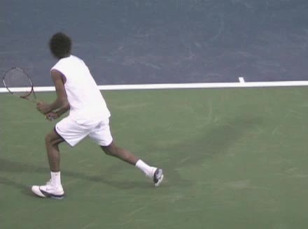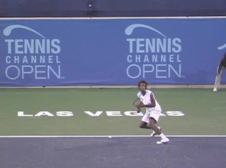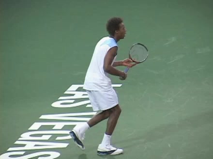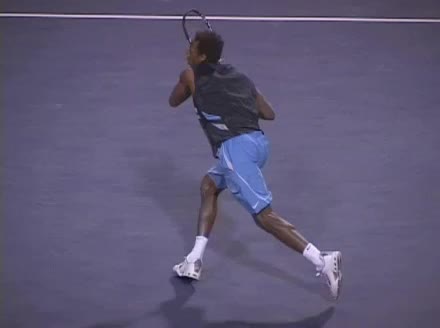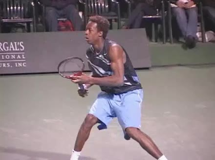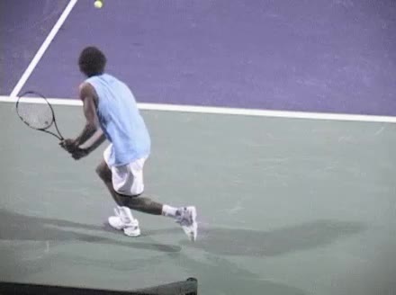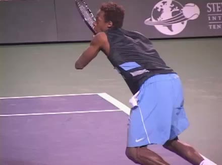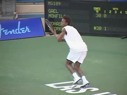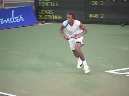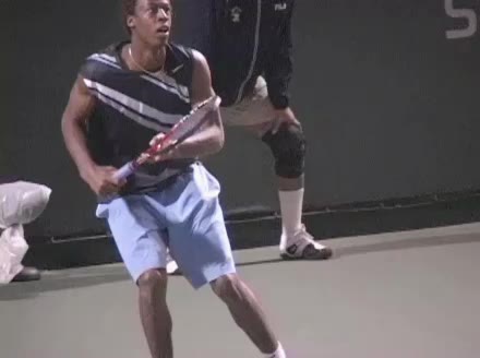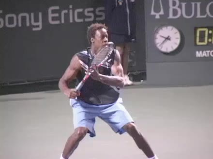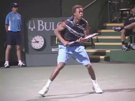 Gael Monfils's running forehand slice from the deuce side, filmed from the side. His shoulders rotate early as he sprints, then his trunk stays relatively closed through contact with a late uncoil that lets the non-dominant arm counter-rotate and stabilize the upper body.