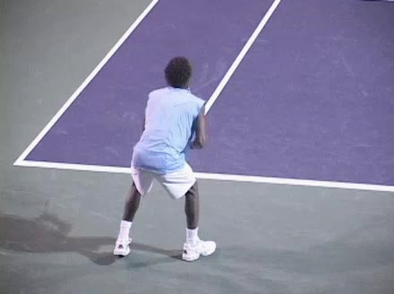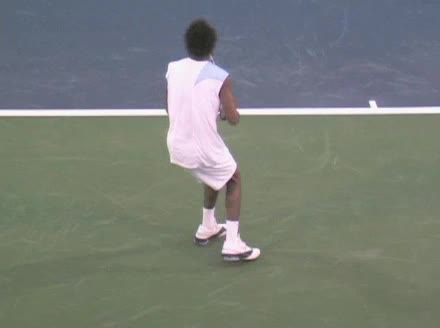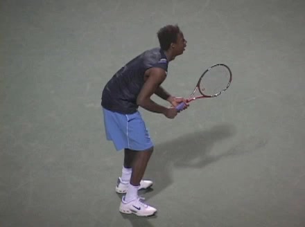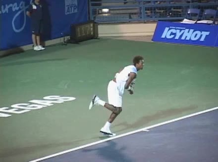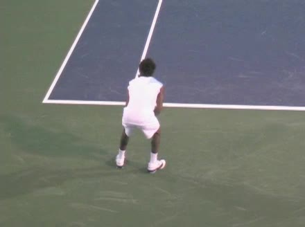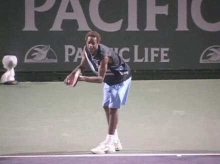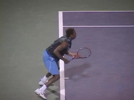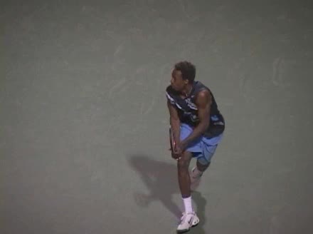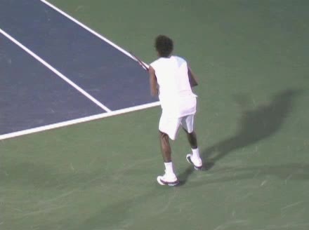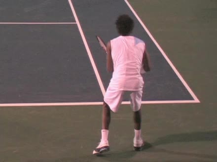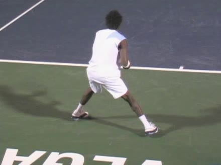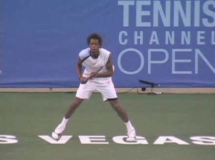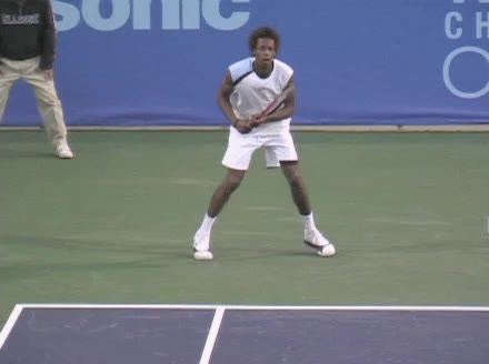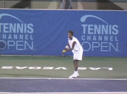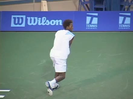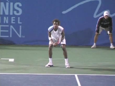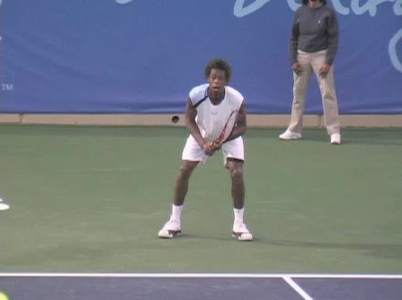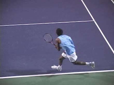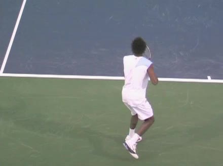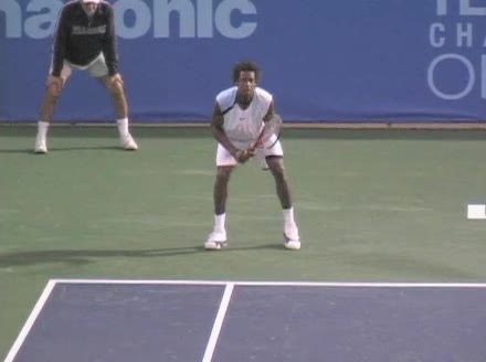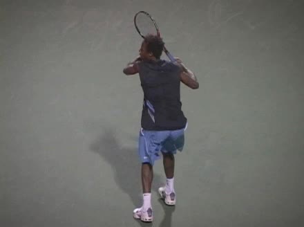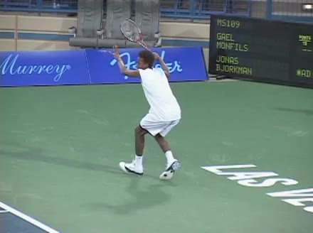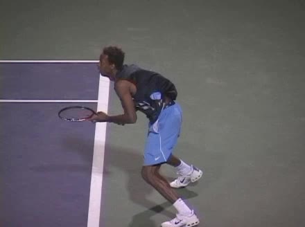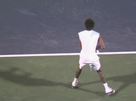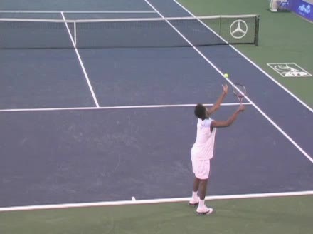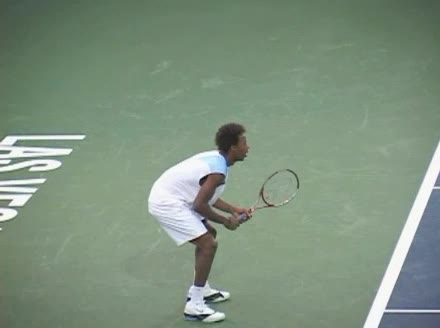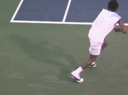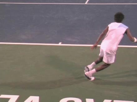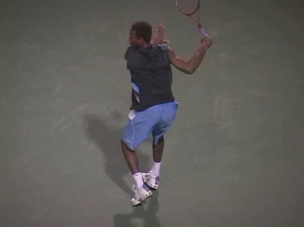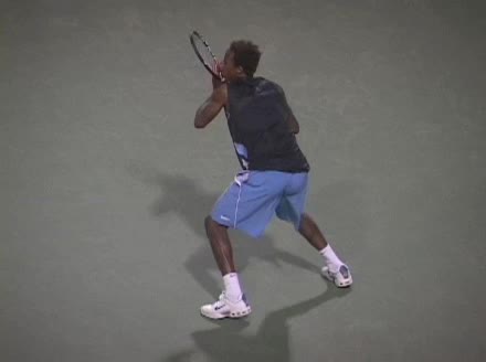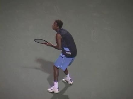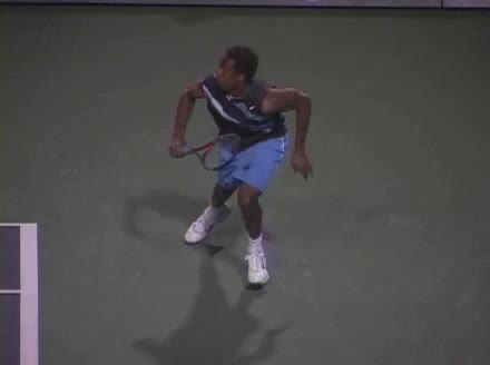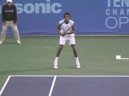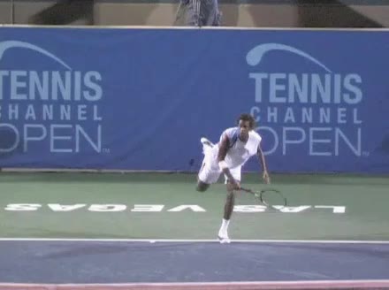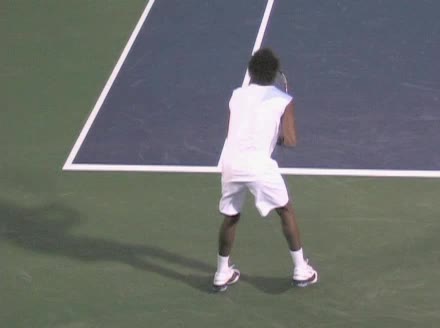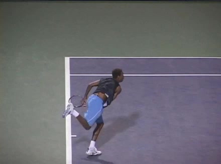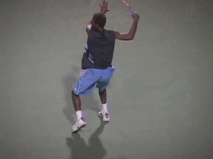 Gael Monfils's second serve from the deuce side, filmed from a rear angle. After contact his torso continues rotating into the court with his back leg swinging through, helping him land inside the baseline and quickly organize into a balanced ready position.