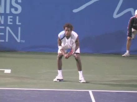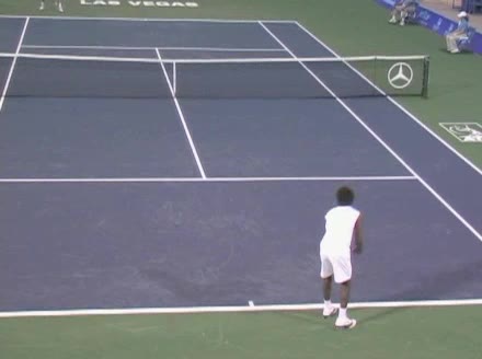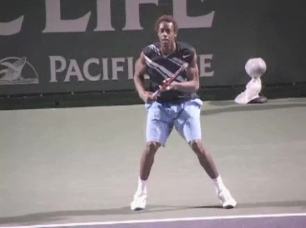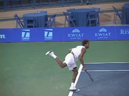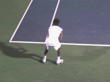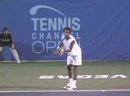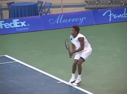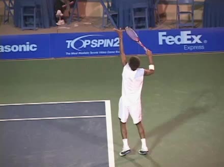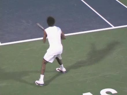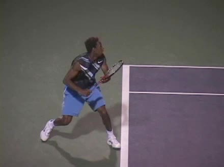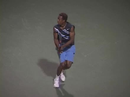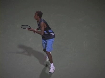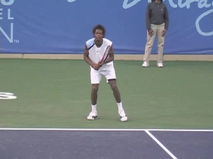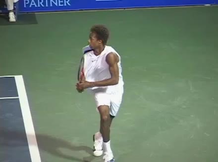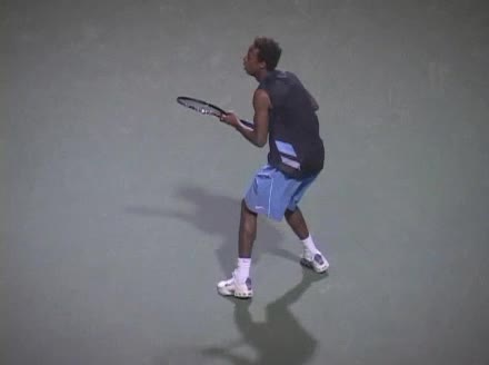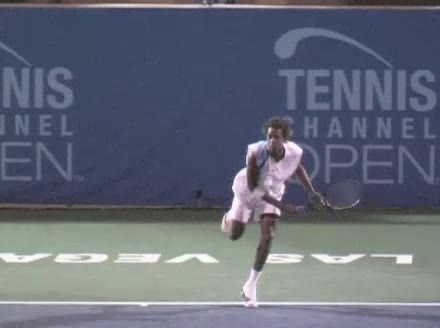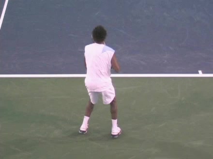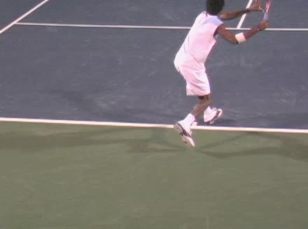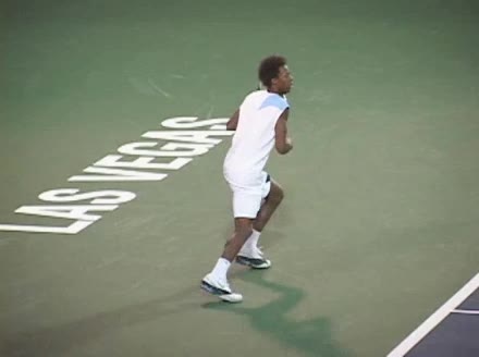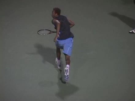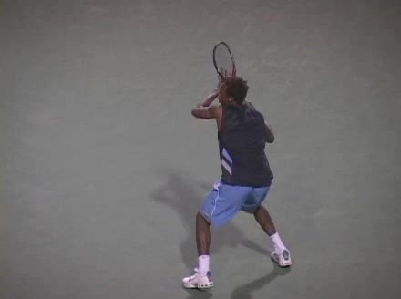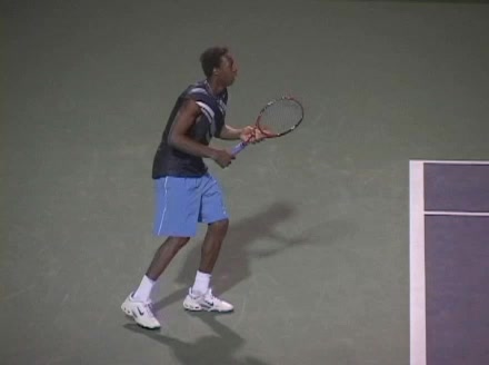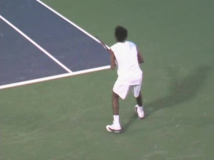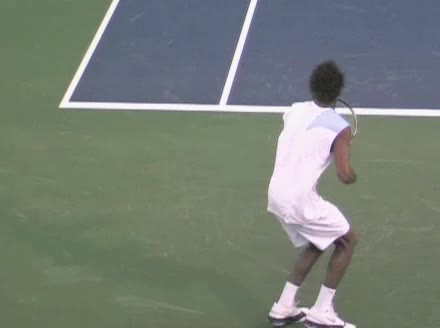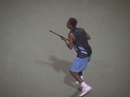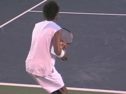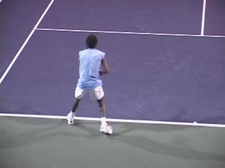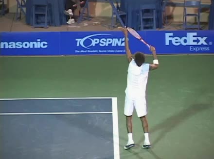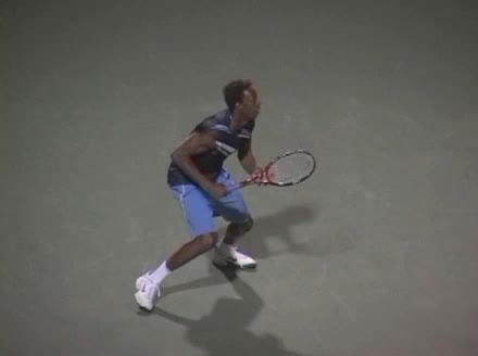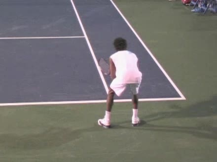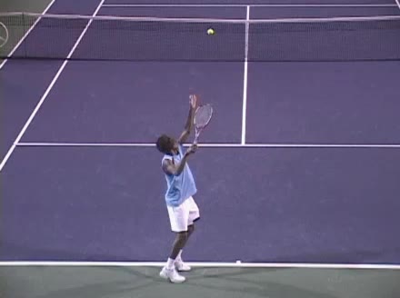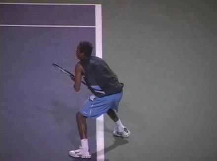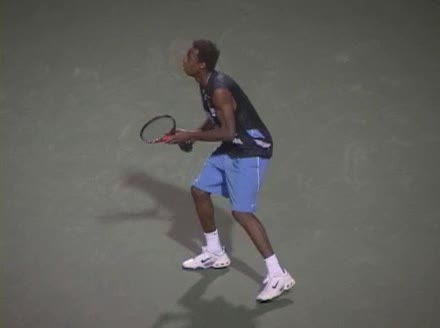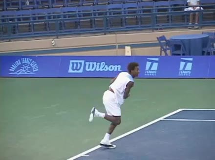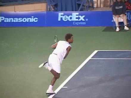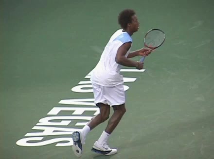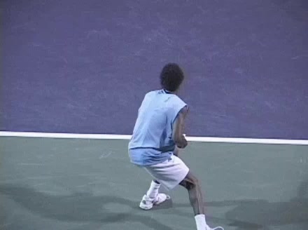 Gael Monfils's second serve from the deuce side, filmed from a rear angle. After contact his torso continues rotating into the court with his back leg swinging through, helping him land inside the baseline and quickly organize into a balanced ready position.