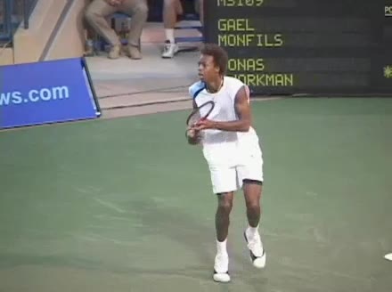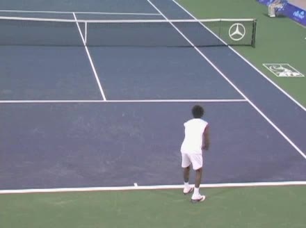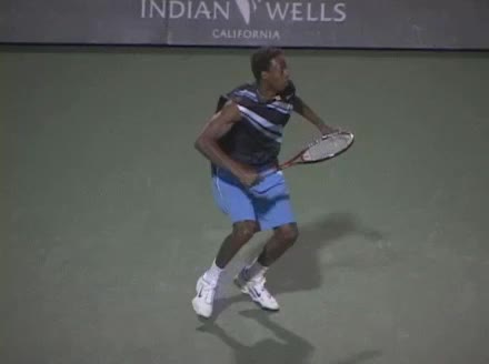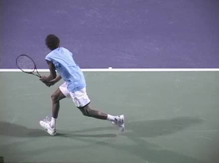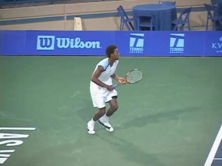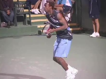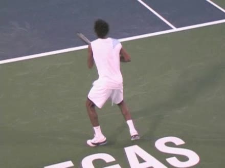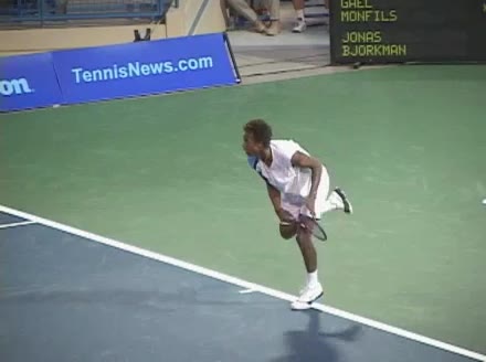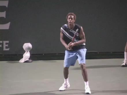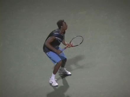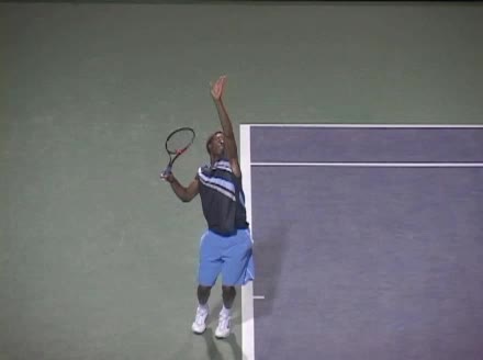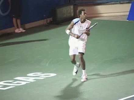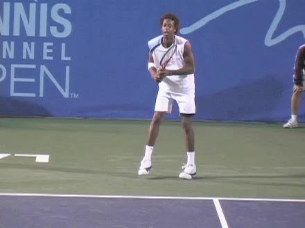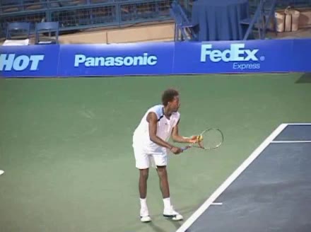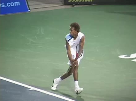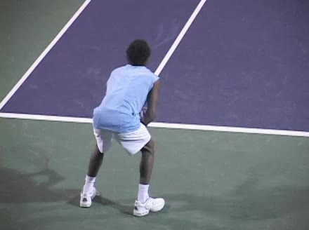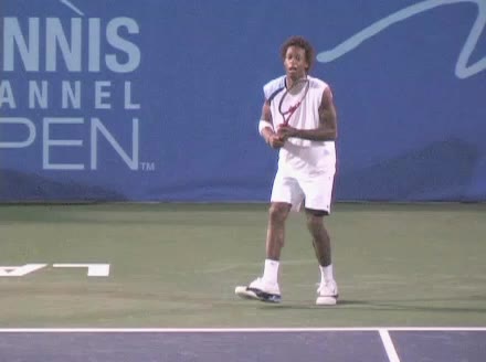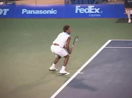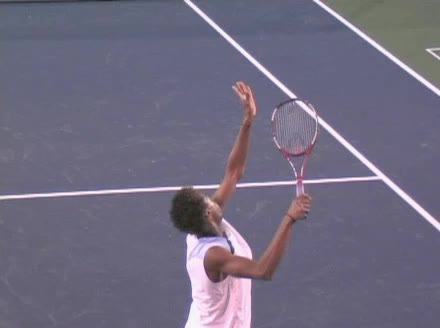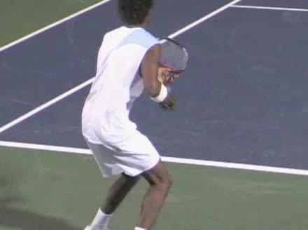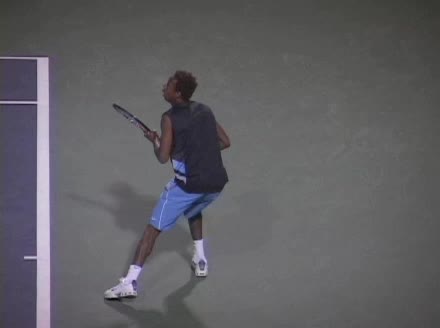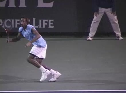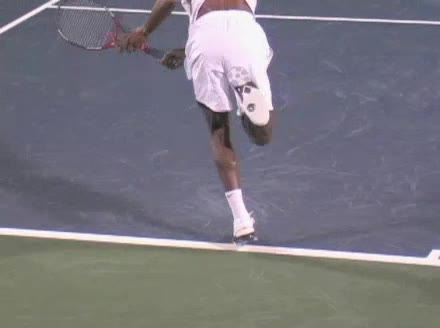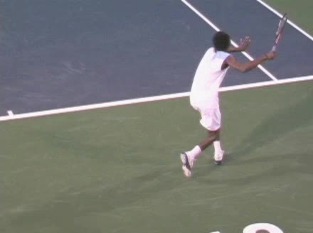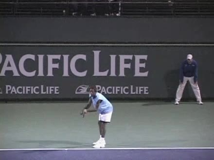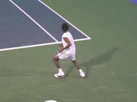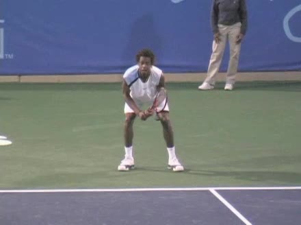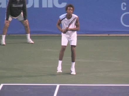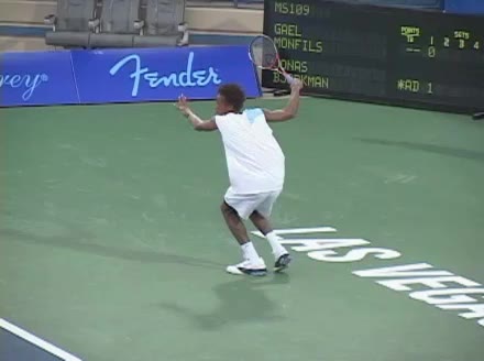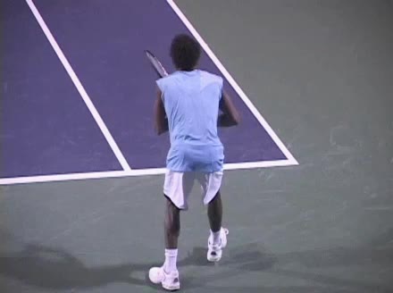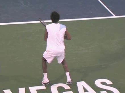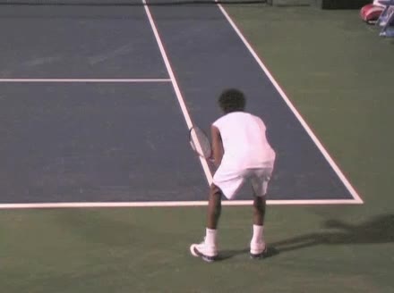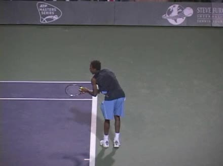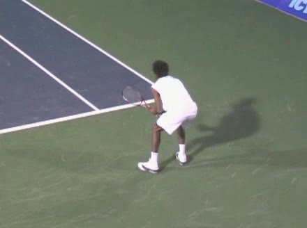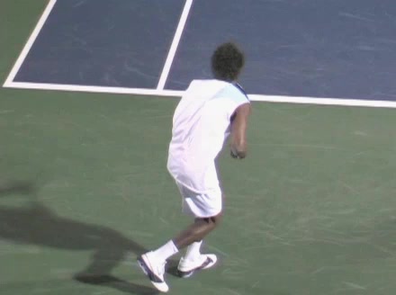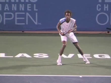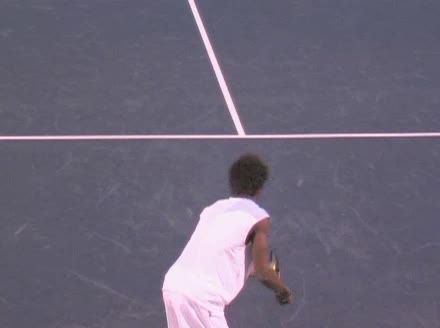 Gael Monfils's second serve from the deuce side, filmed from a rear angle. After contact his torso continues rotating into the court with his back leg swinging through, helping him land inside the baseline and quickly organize into a balanced ready position.