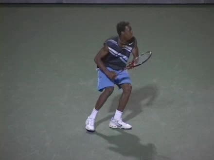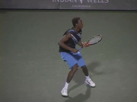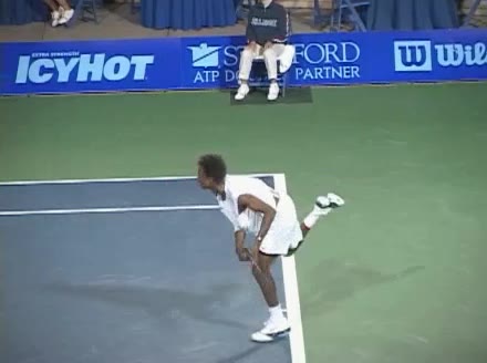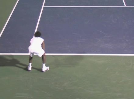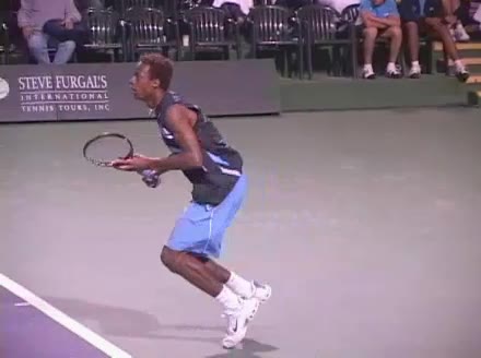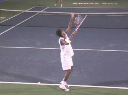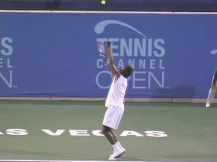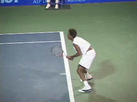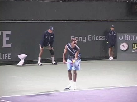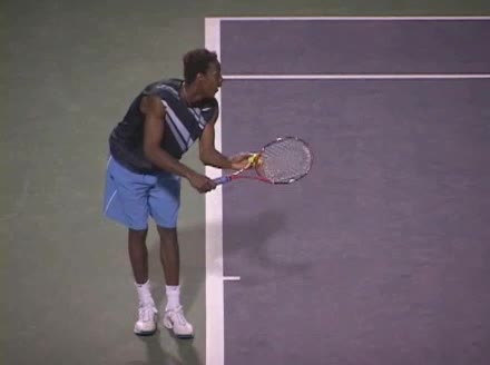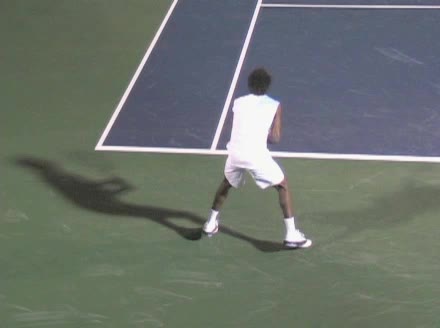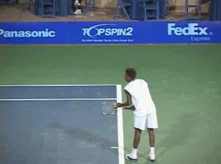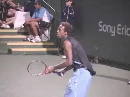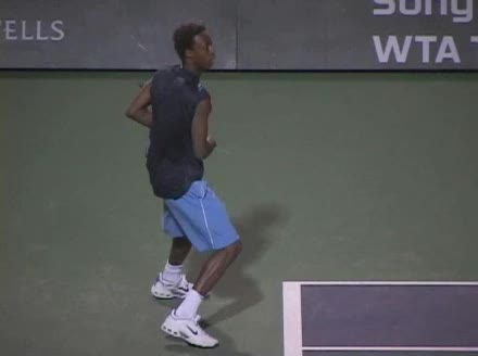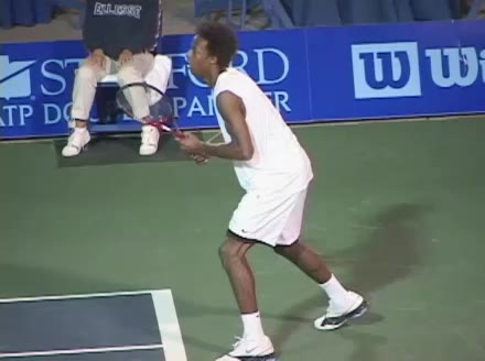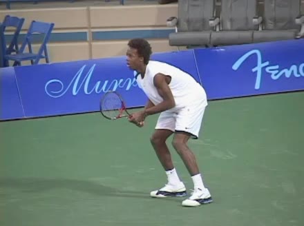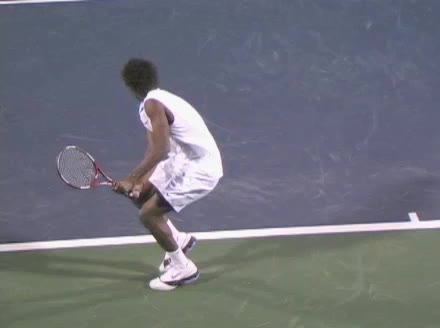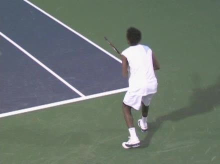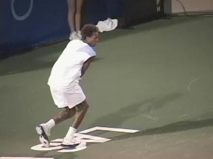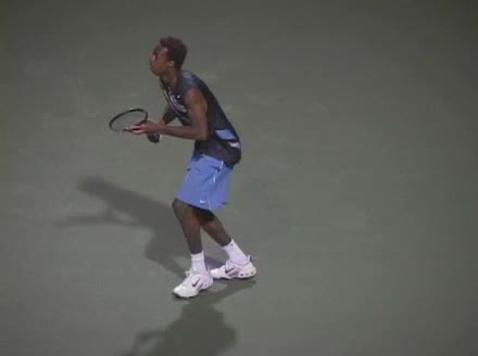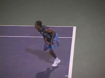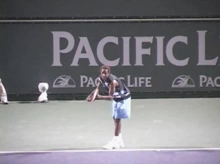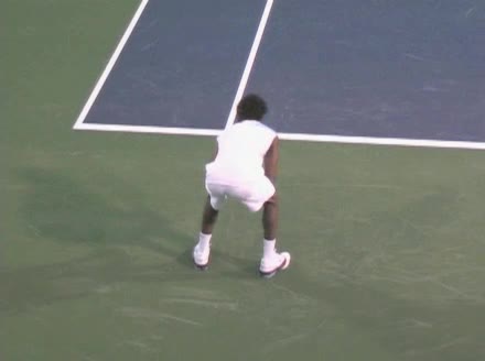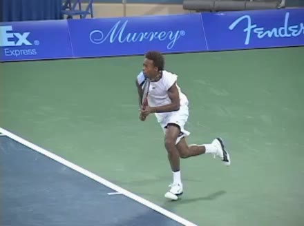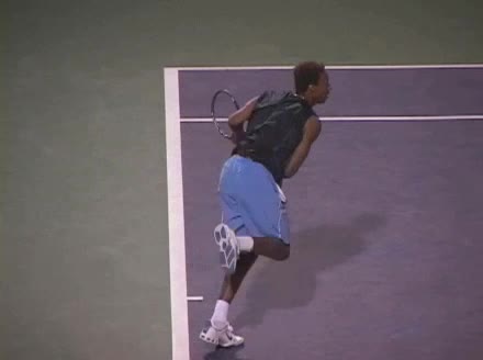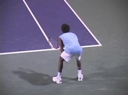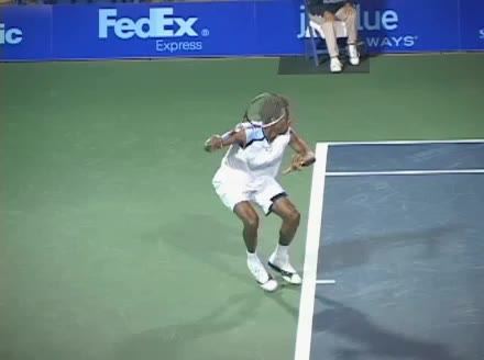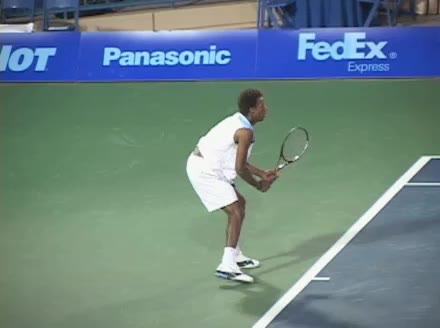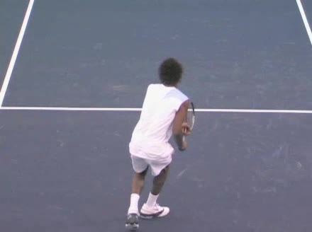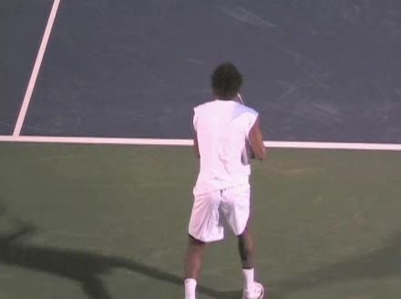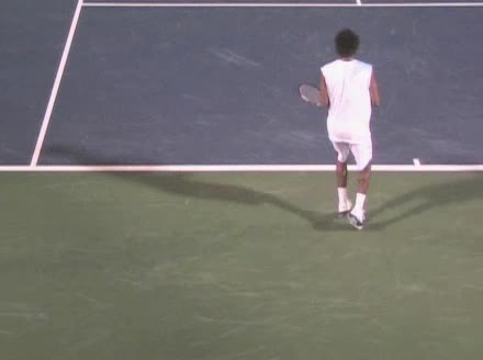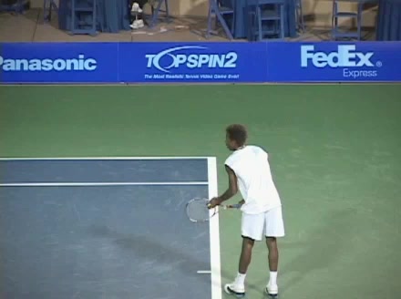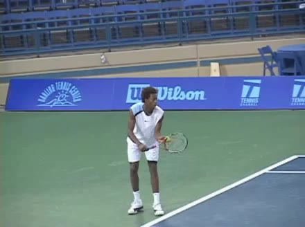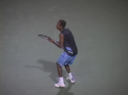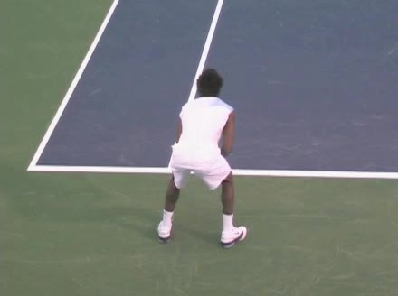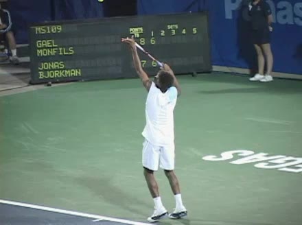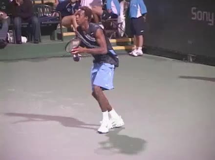Gael Monfils's second serve from the deuce side, filmed from a rear angle. After contact his torso continues rotating into the court with his back leg swinging through, helping him land inside the baseline and quickly organize into a balanced ready position.