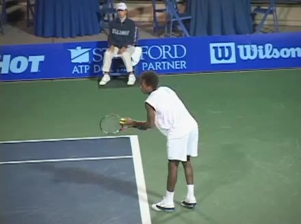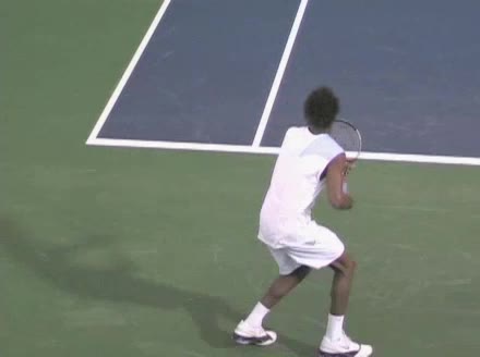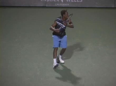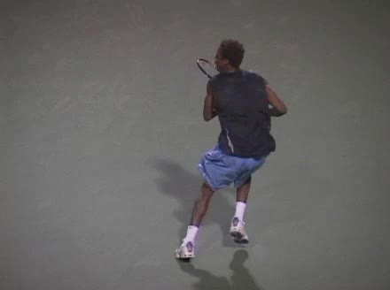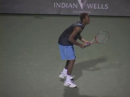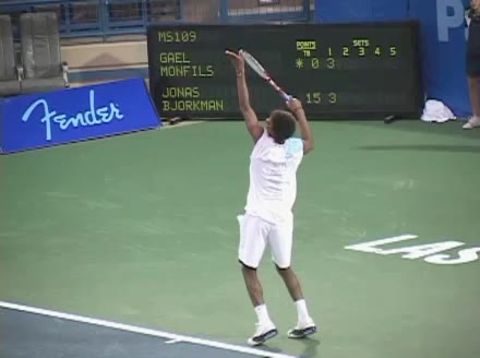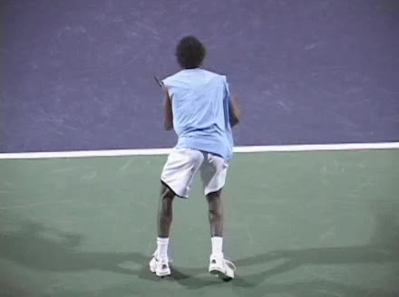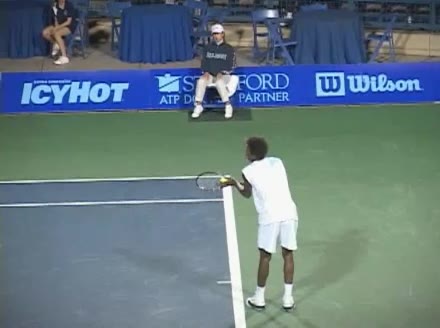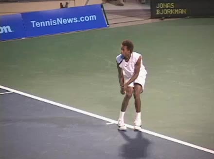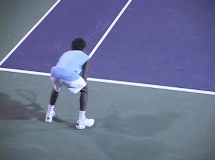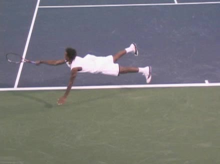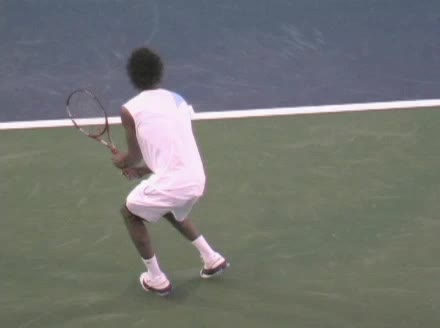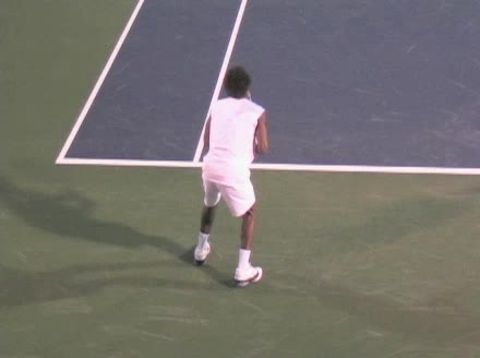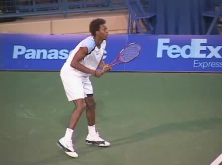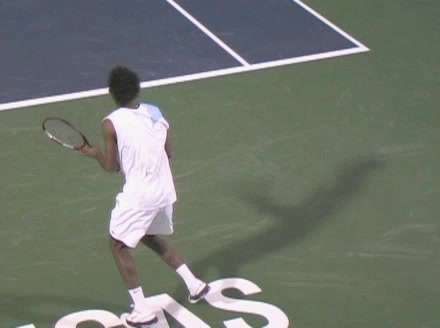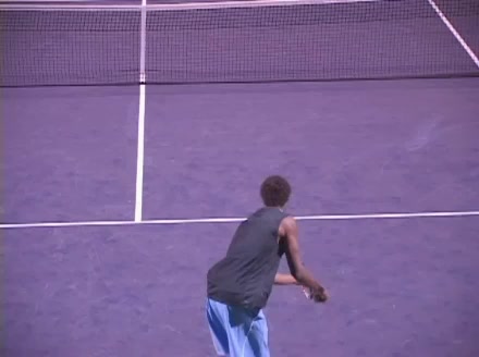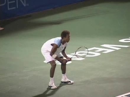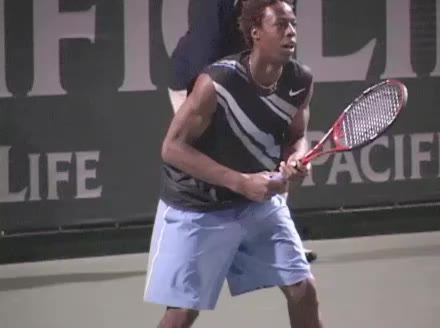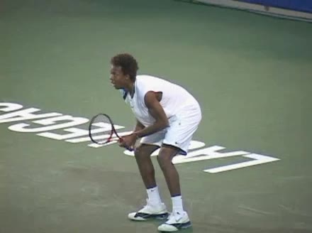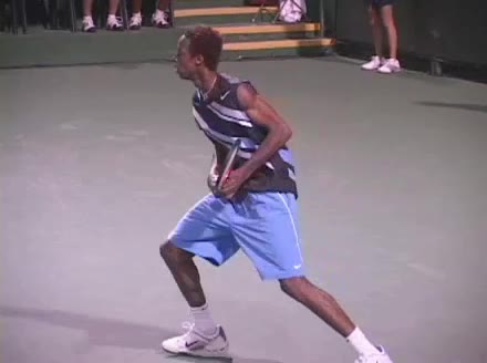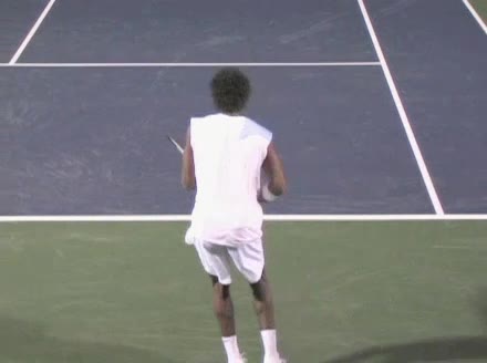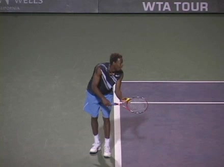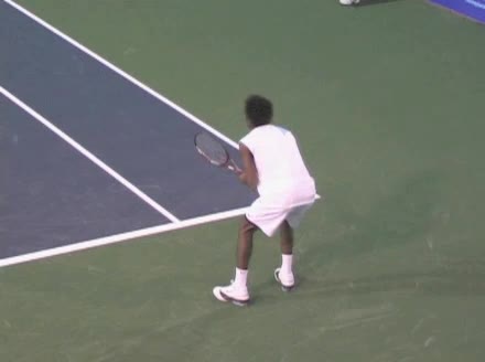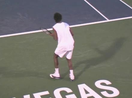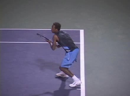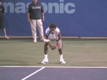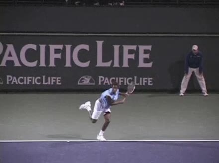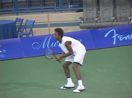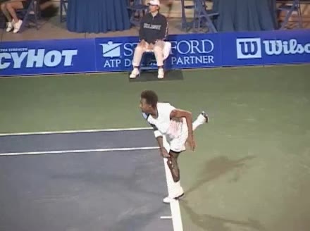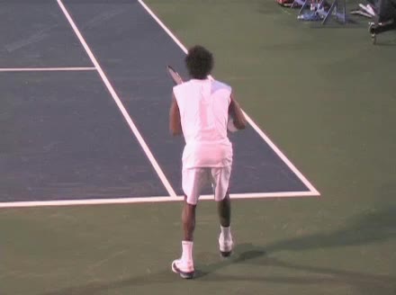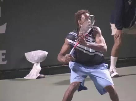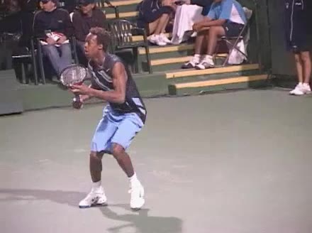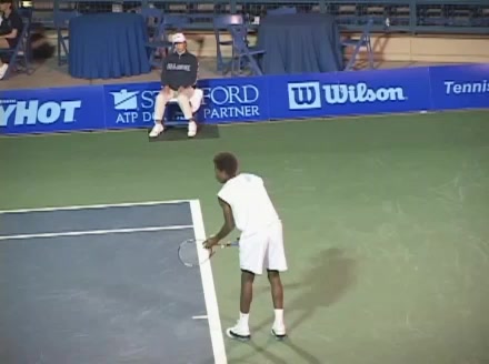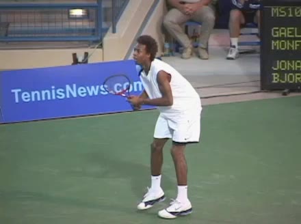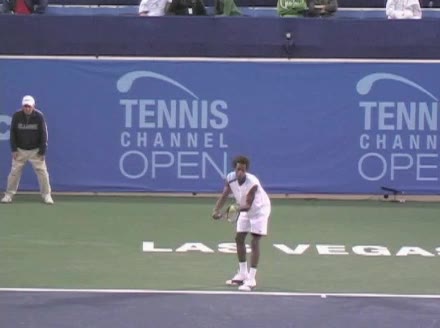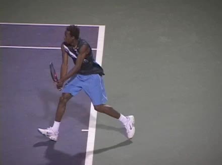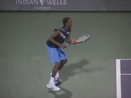 Gael Monfils's second serve from the deuce side, filmed from a rear angle. After contact his torso continues rotating into the court with his back leg swinging through, helping him land inside the baseline and quickly organize into a balanced ready position.
