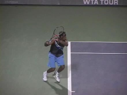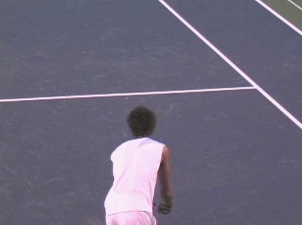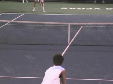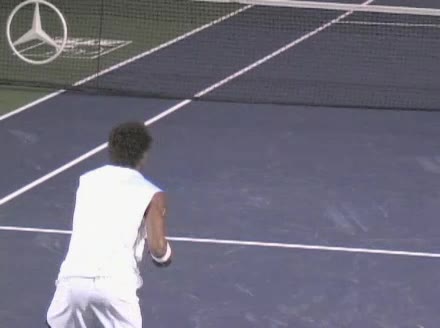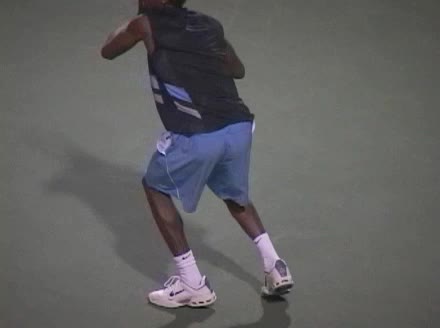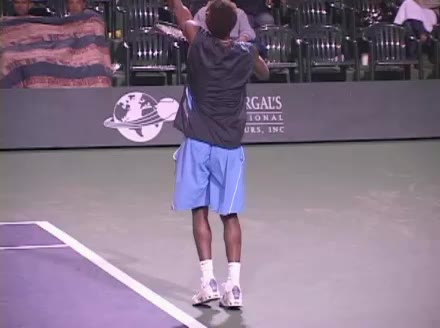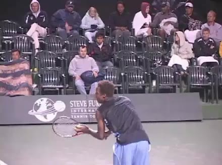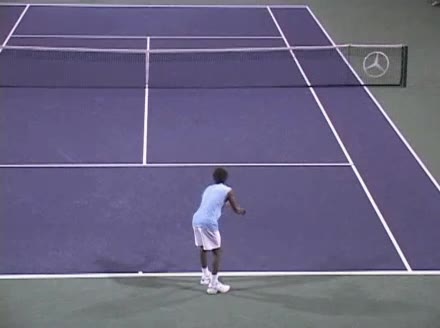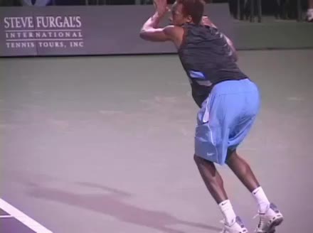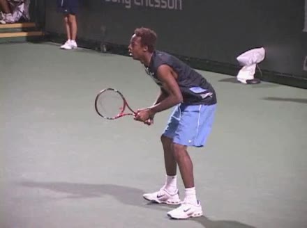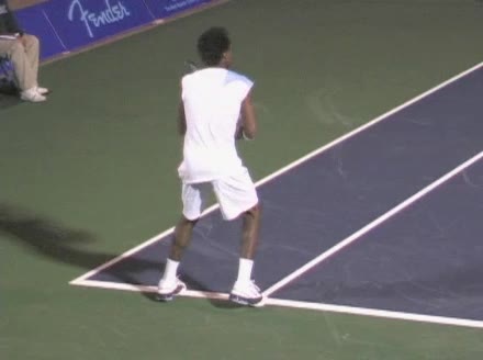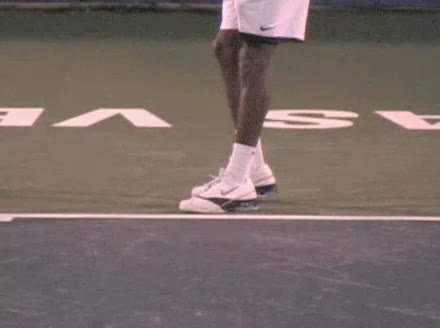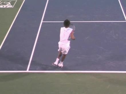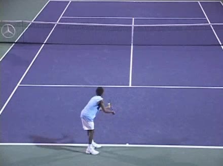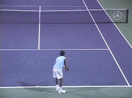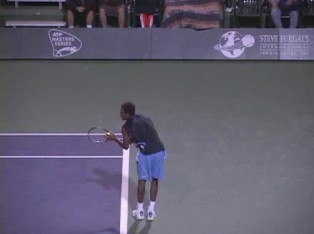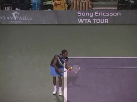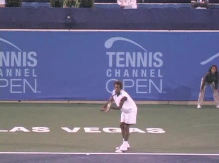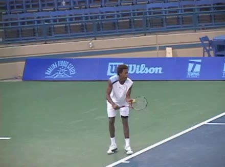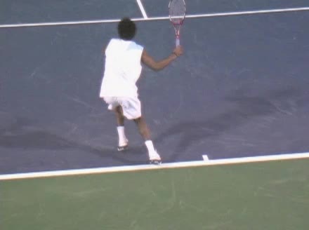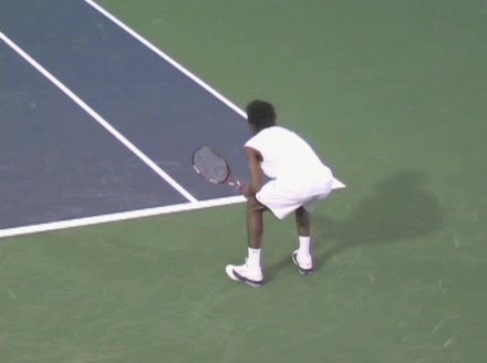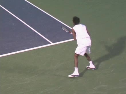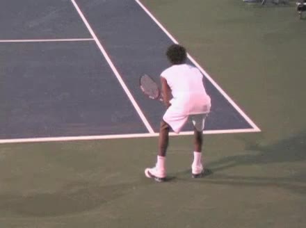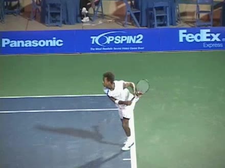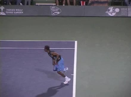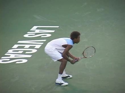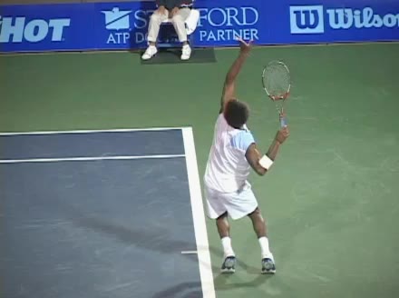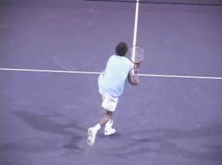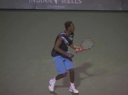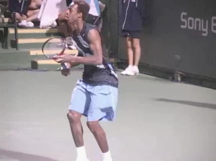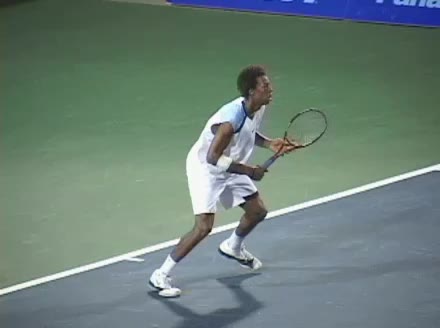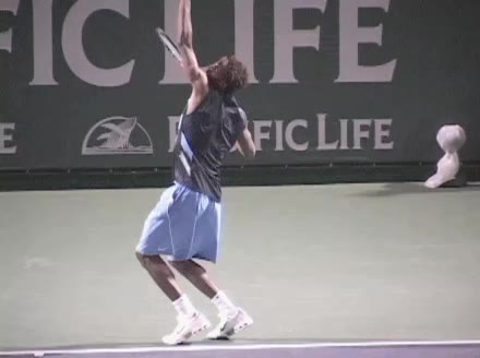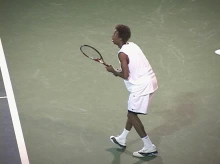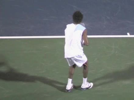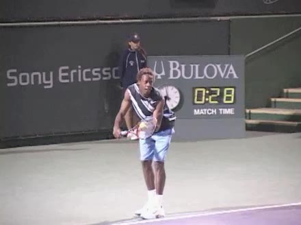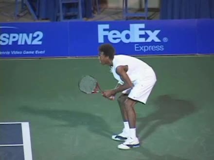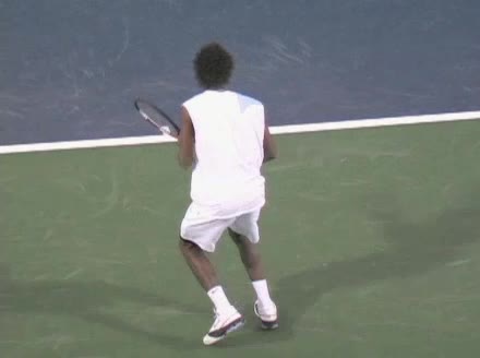 Gael Monfils's second serve from the deuce side, filmed from a rear angle. After contact his torso continues rotating into the court with his back leg swinging through, helping him land inside the baseline and quickly organize into a balanced ready position.