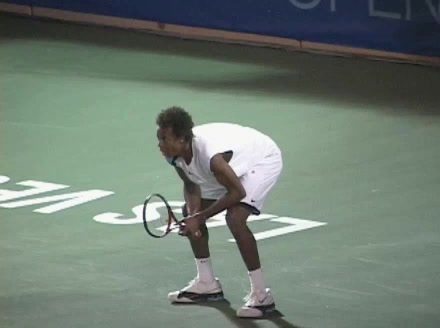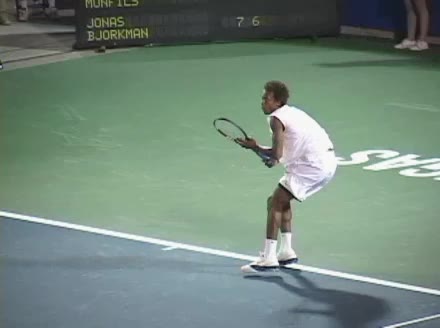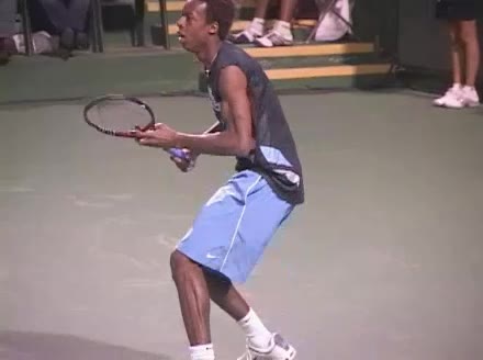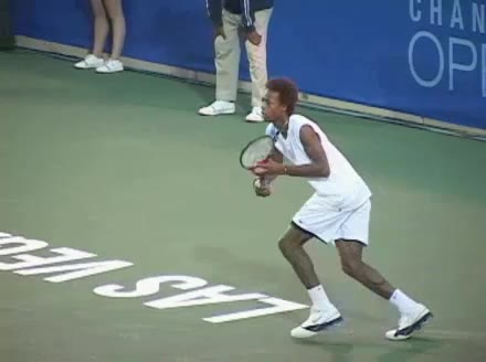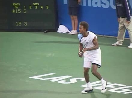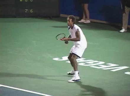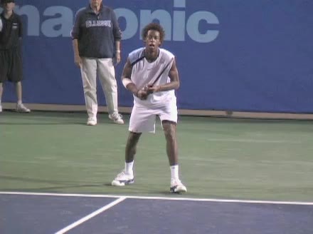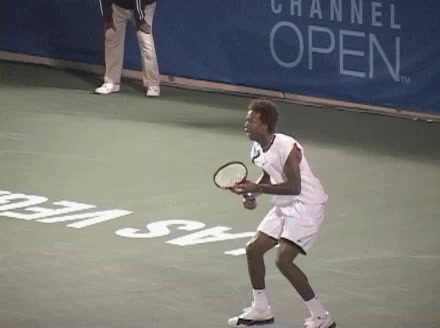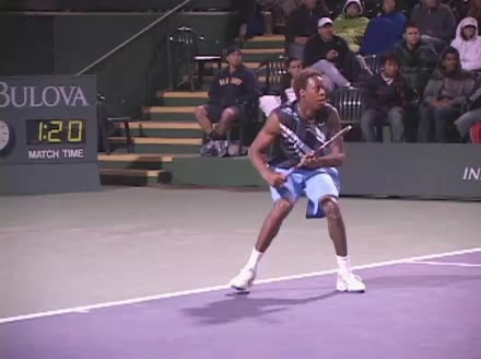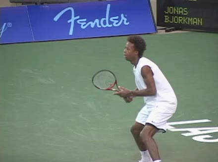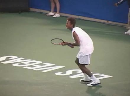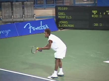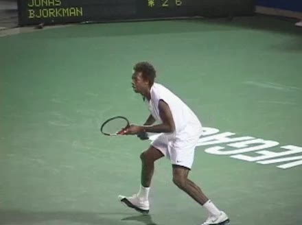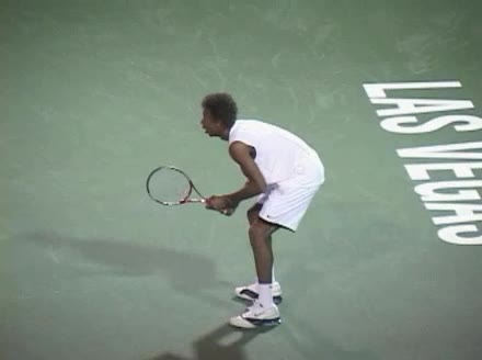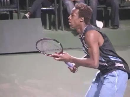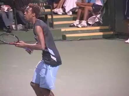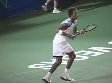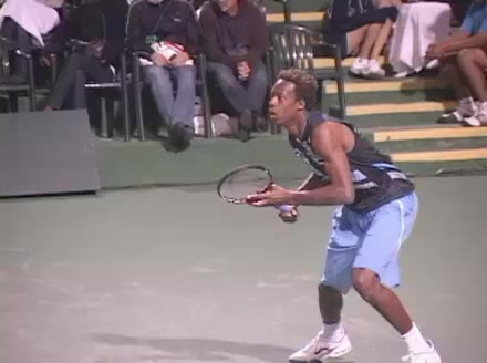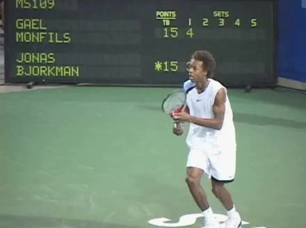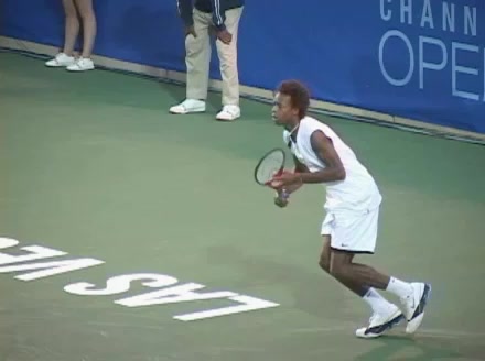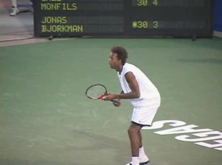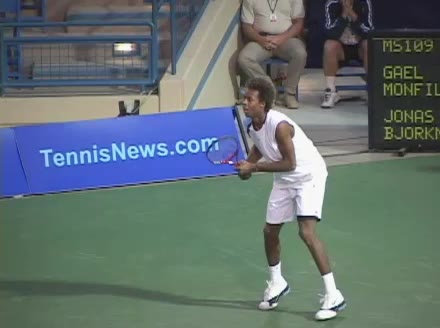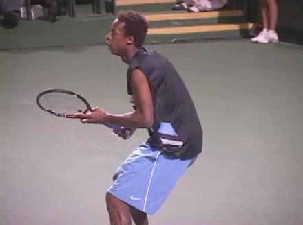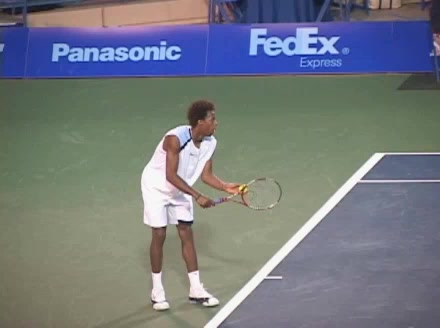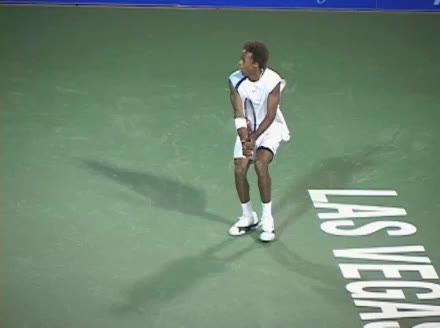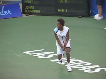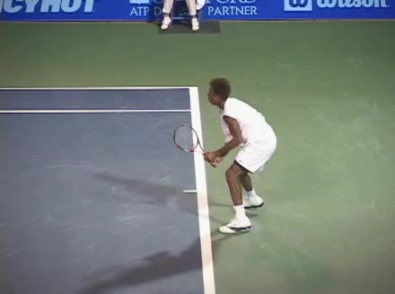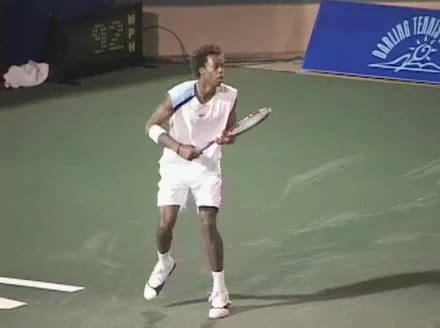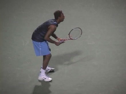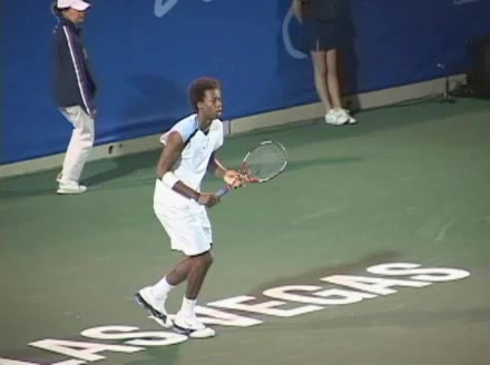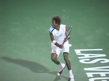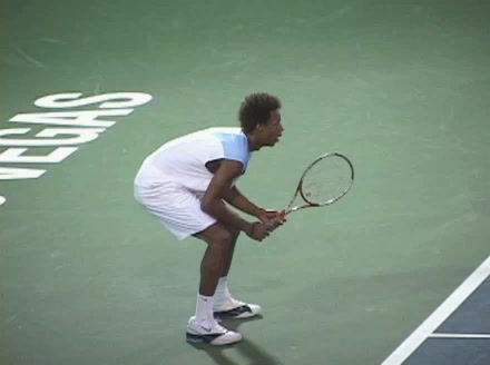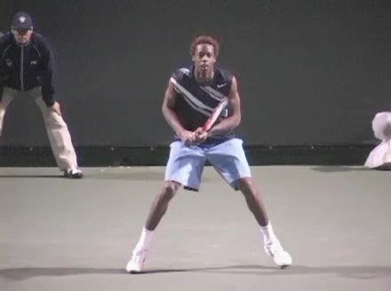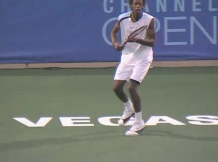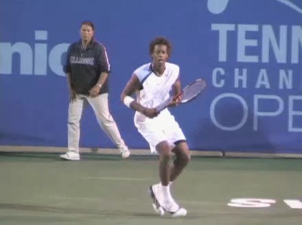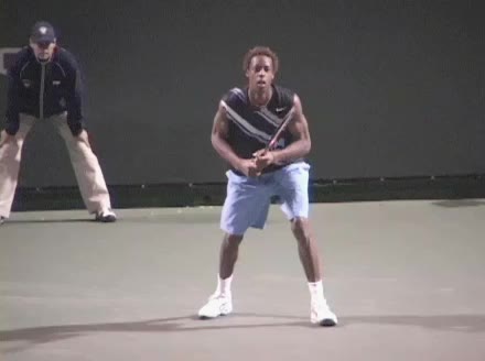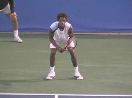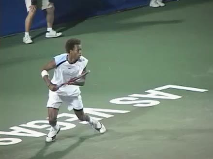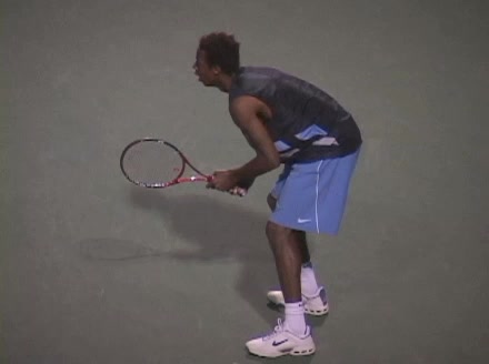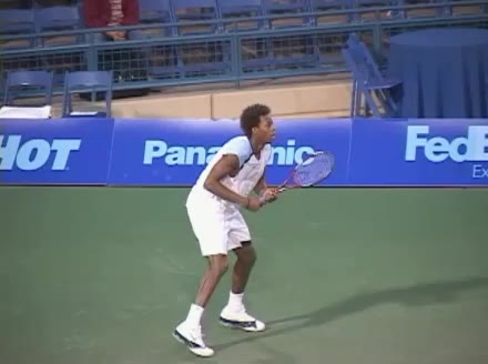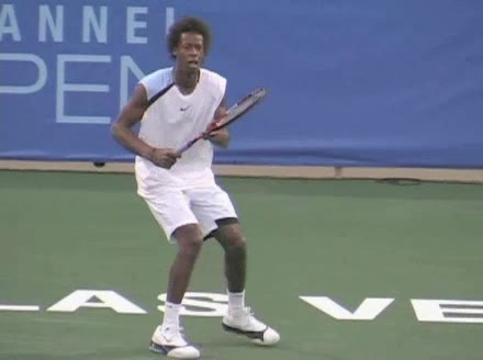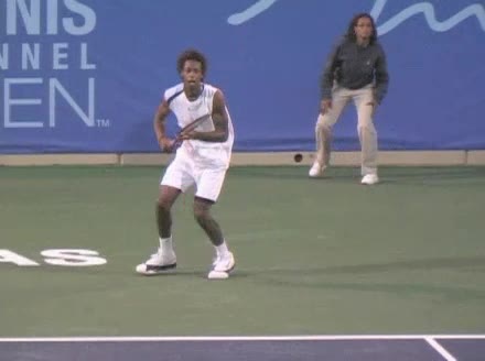 Gael Monfils's wide backhand from the middle of the court, filmed from a court_level front angle. From this angle you can clearly see his two-handed grip stay firm while his wrists stay relatively quiet through the backswing, then release into a subtle upward snap at contact to add spin.
