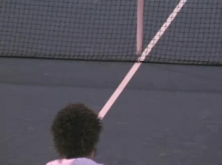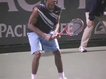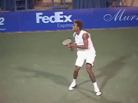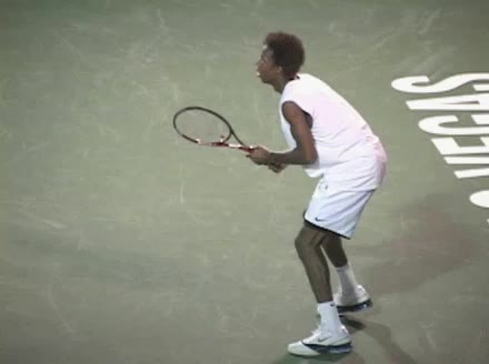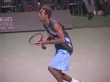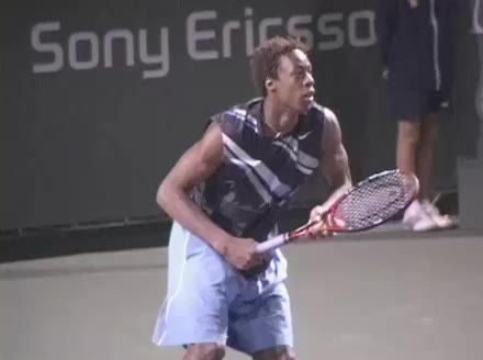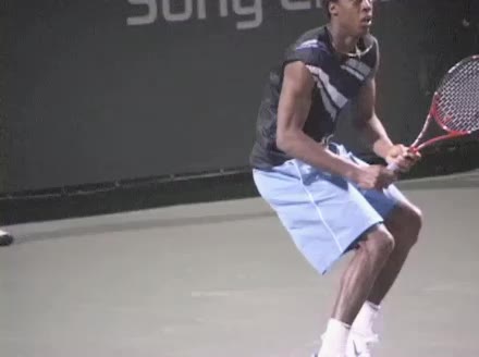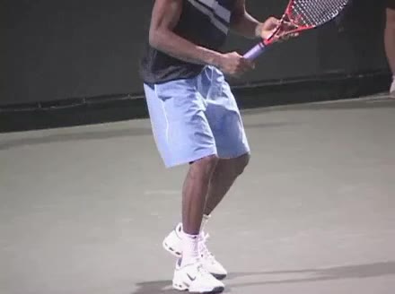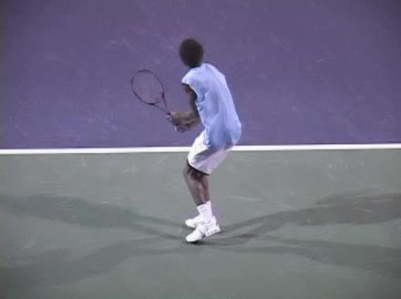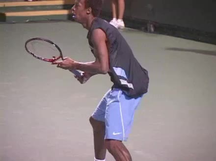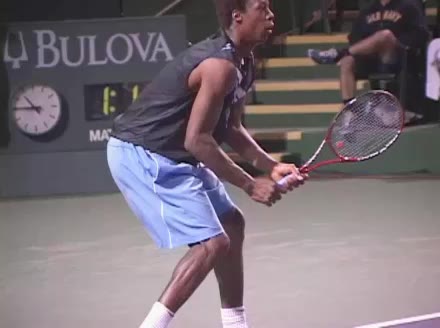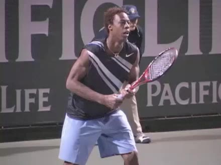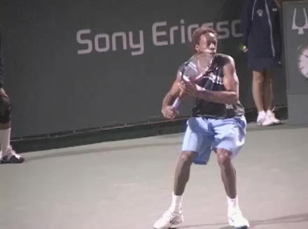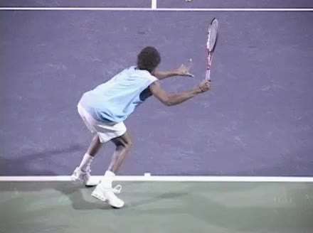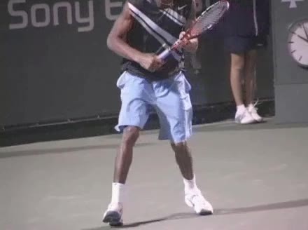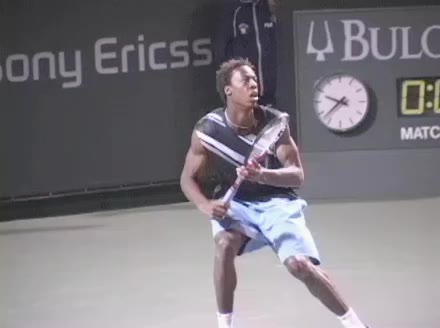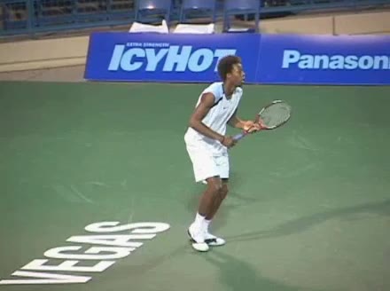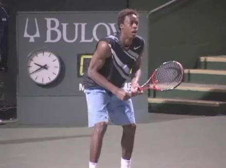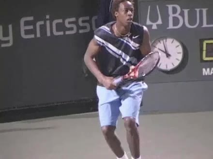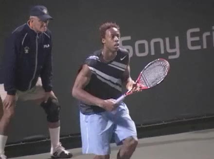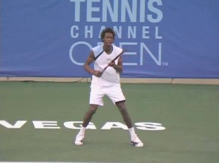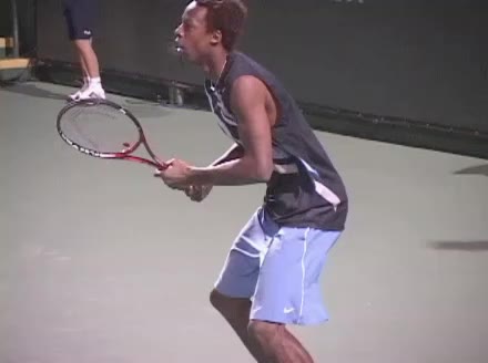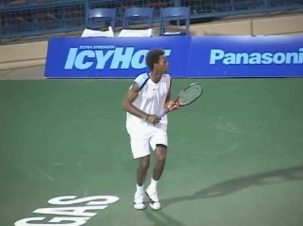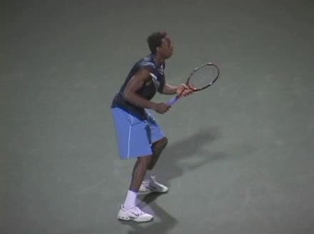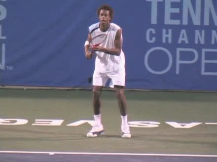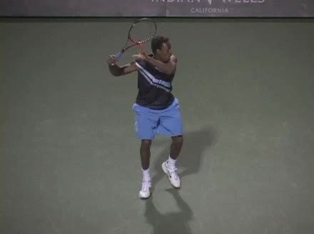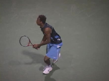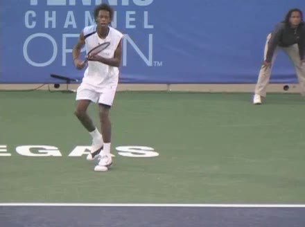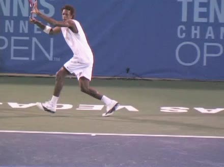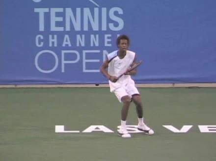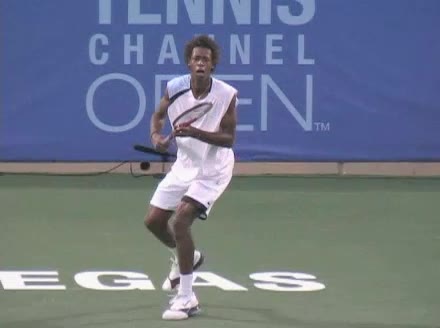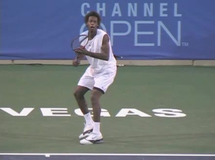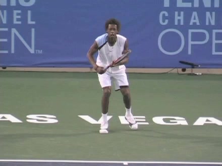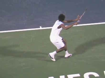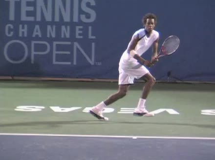 Gael Monfils's backhand from the center of the court in a closed stance, filmed from the front. His follow-through finishes high with the non-hitting hand releasing the racquet early as he transfers weight onto his front leg and quickly resets the racquet in front for the next shot.