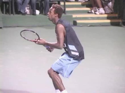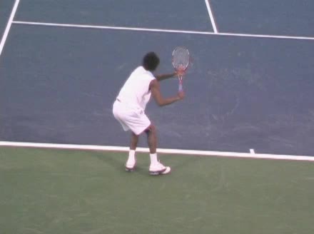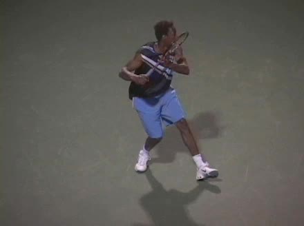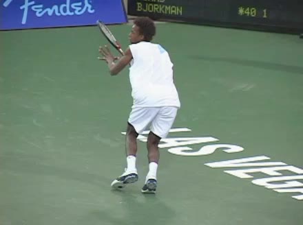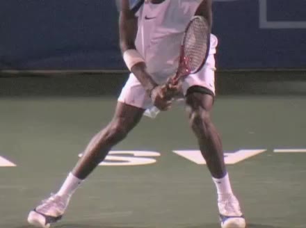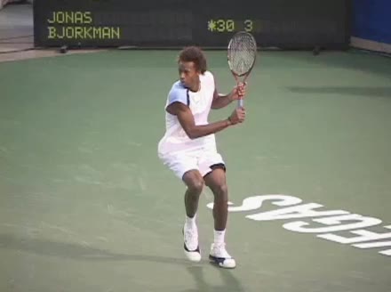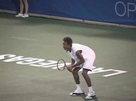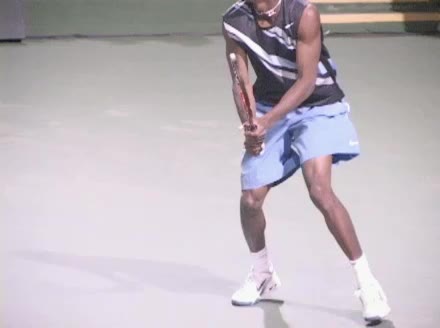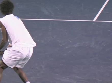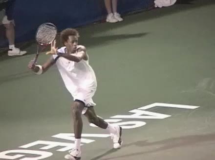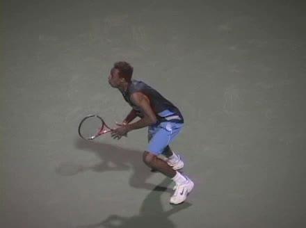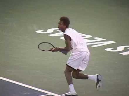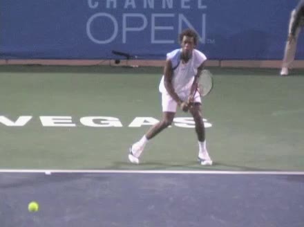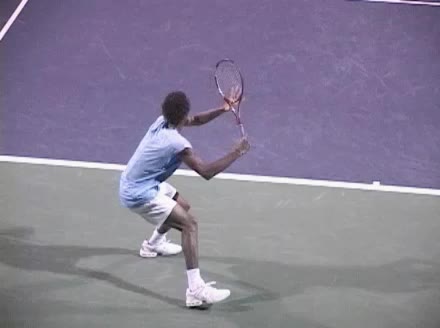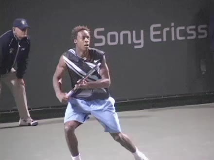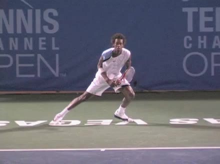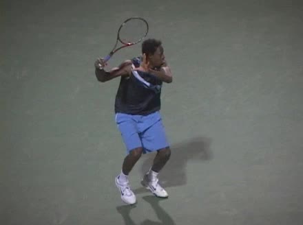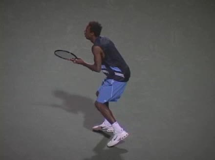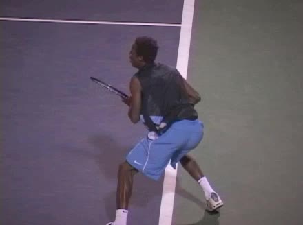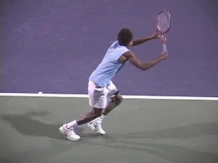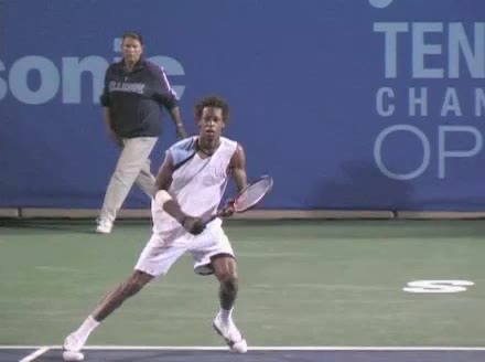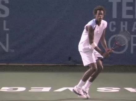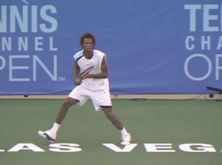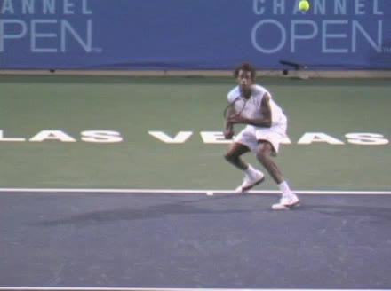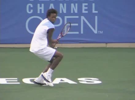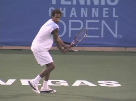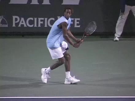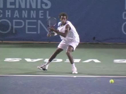 Gael Monfils's backhand from the center of the court, filmed from a court-level side angle. His hips stay relatively closed at the start with a pronounced knee bend, then unwind as his legs drive upward and forward through contact.
