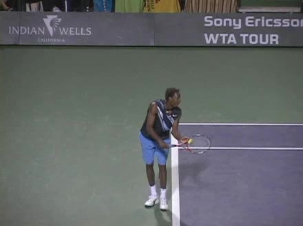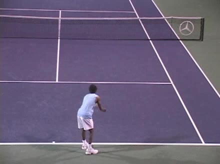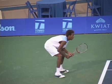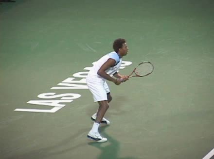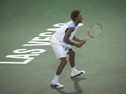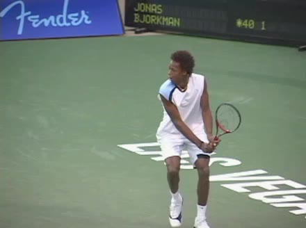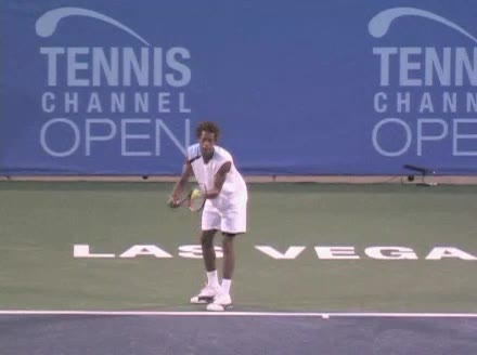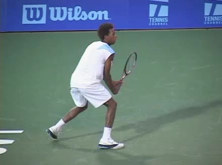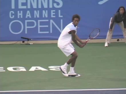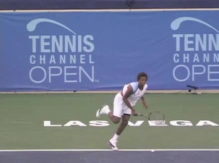 Gael Monfils's backhand slice from a wide position, filmed from the side. From this angle you can clearly see his continental grip with a laid-back wrist, maintaining a firm but relaxed wrist position through contact to keep the racket face stable.