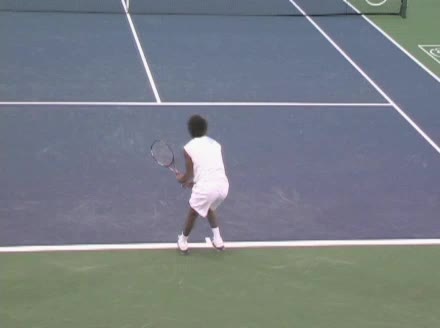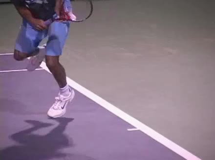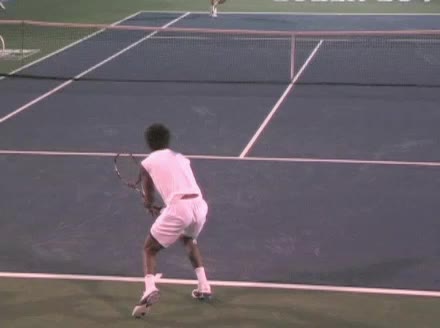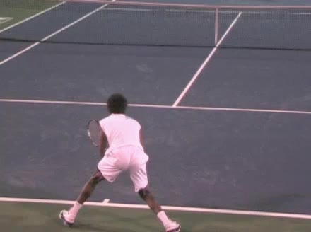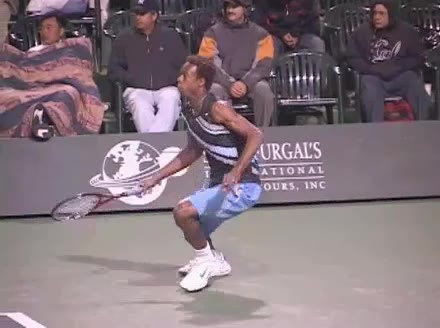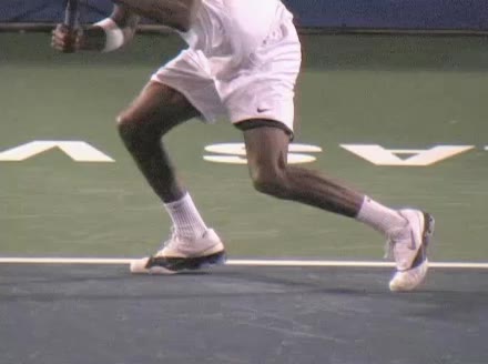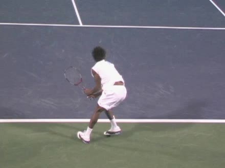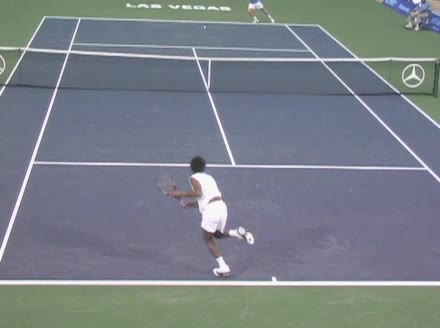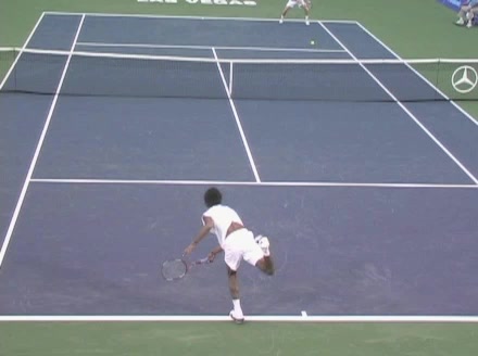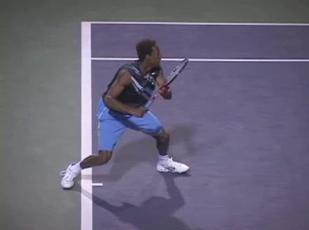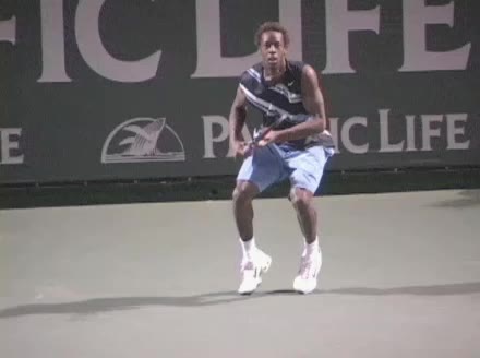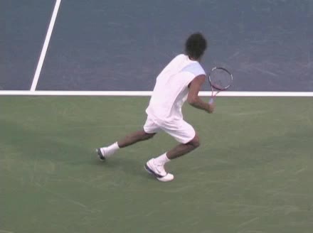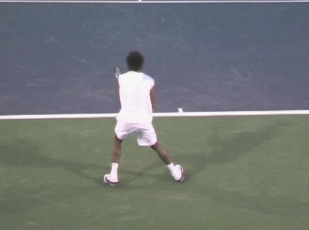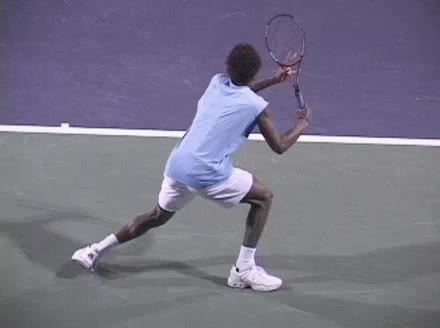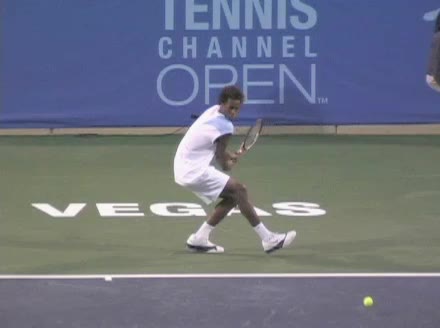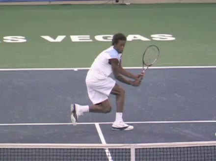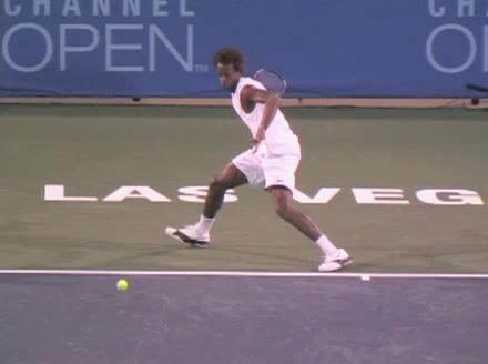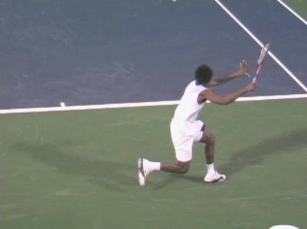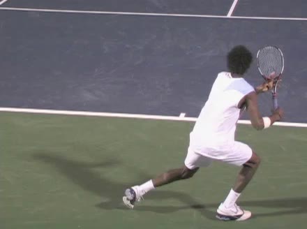 Gael Monfils's forehand drop shot approach followed by a backhand volley from a neutral court position, filmed from the rear. His hips stay relatively low with a pronounced knee bend on the approach, then his legs drive forward with a subtle opening of the hips as he transitions into the backhand volley.
