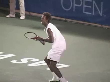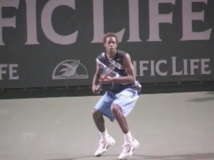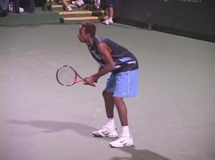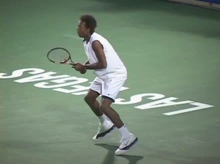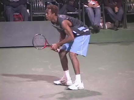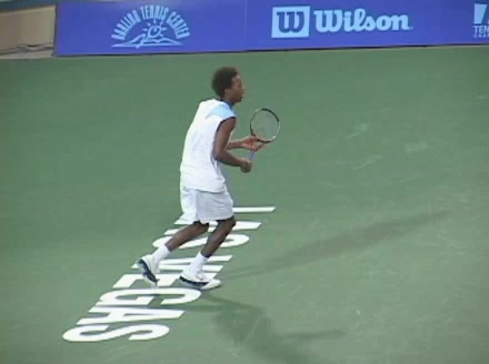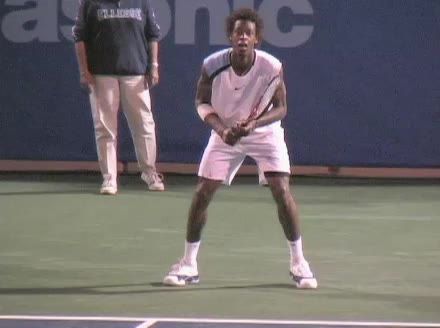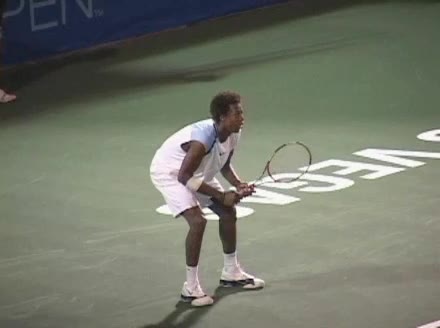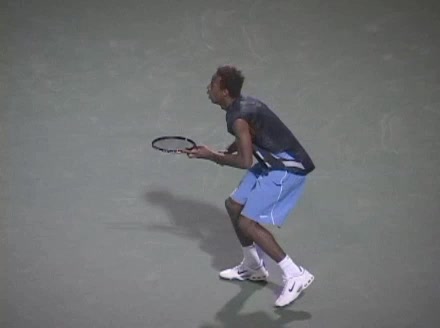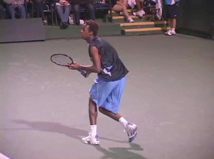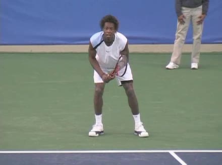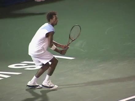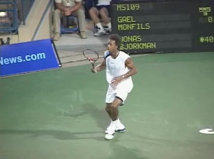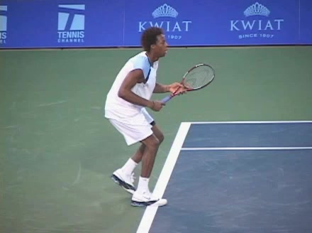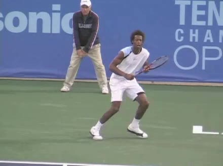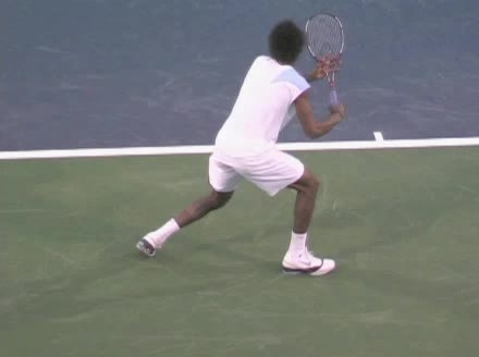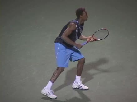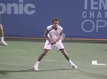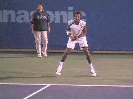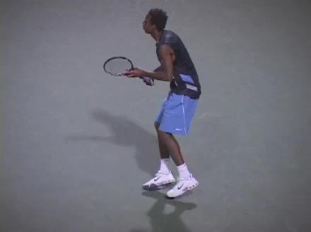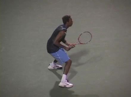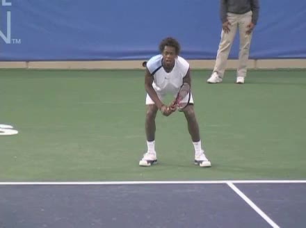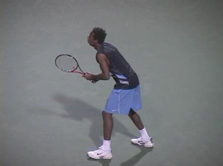 Gael Monfils's backhand from the center of the court, filmed from the front. His closed stance is clear as his front foot steps across his body before contact, with a quick recovery step back toward a neutral position after the swing.