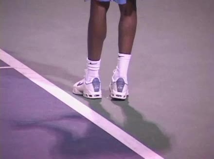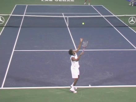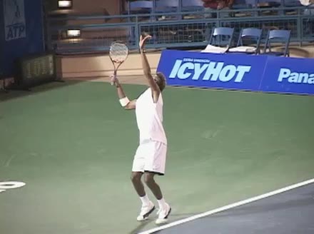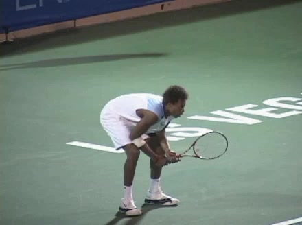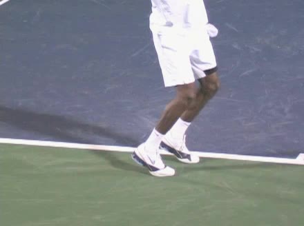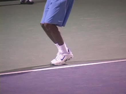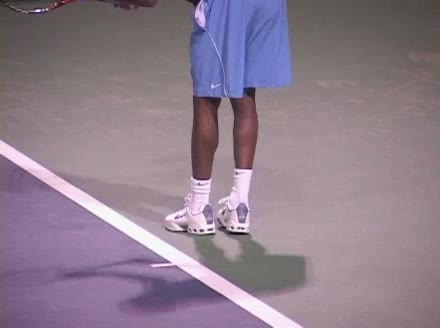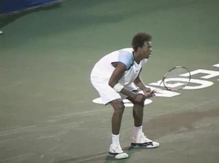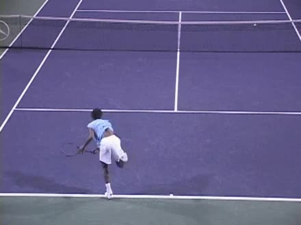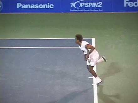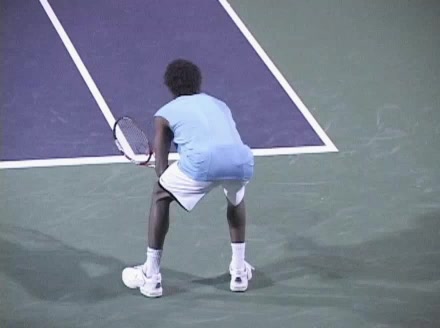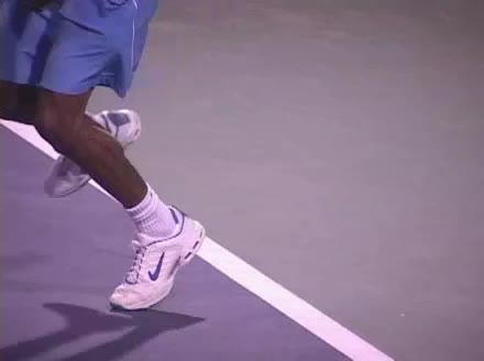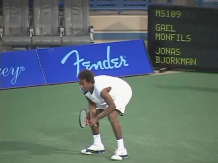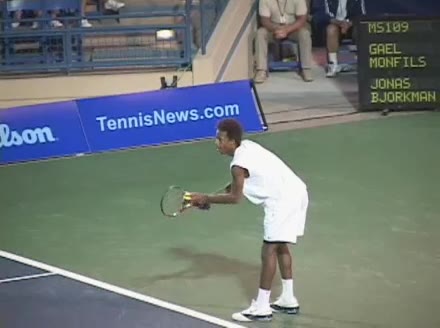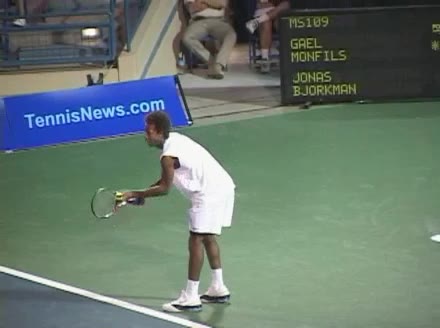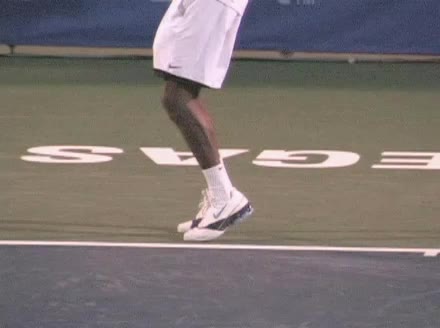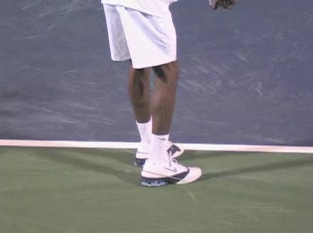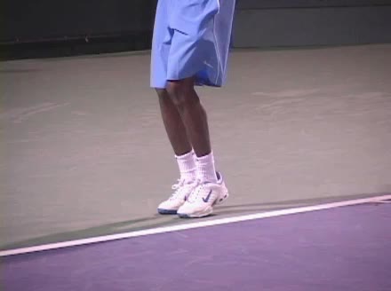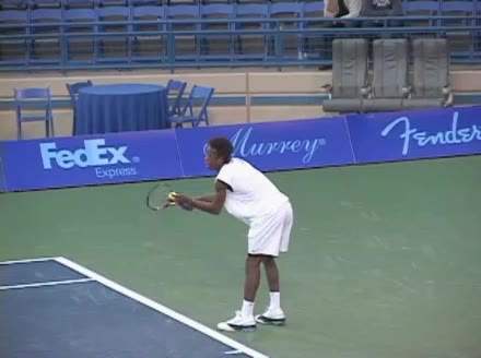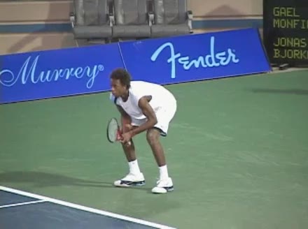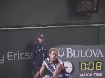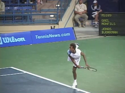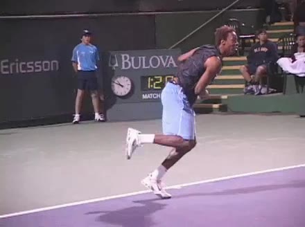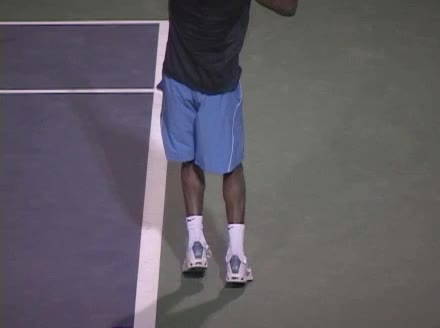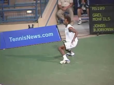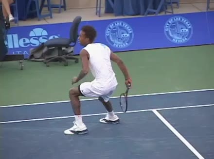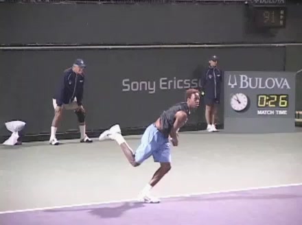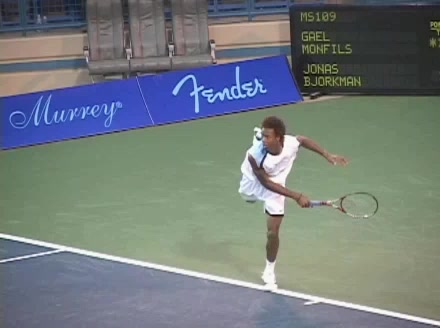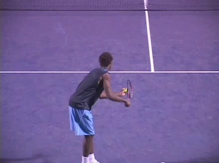 Gael Monfils's second serve from the Ad court, filmed from the side. His hips load in a closed position with a deep knee bend before uncoiling upward as the back leg drives through into the court.