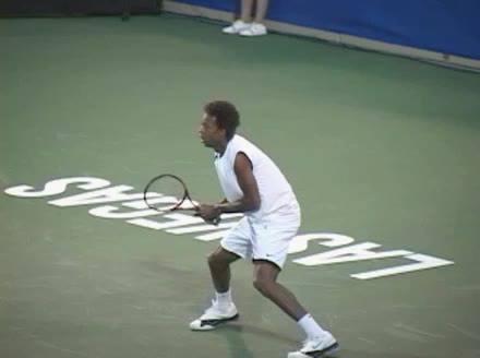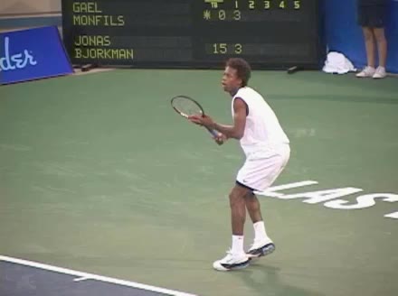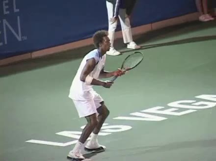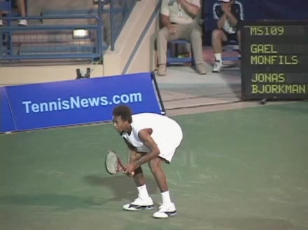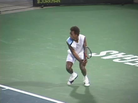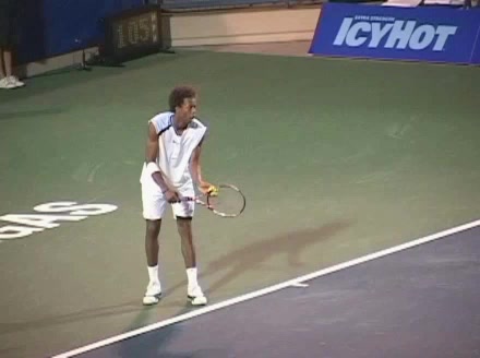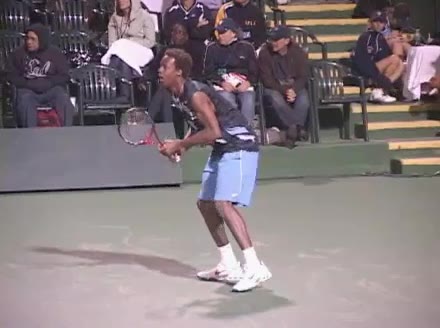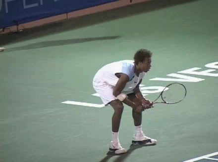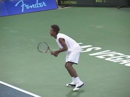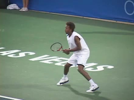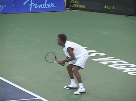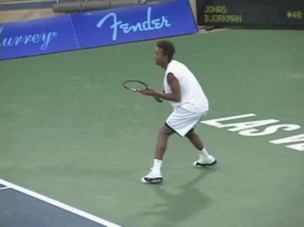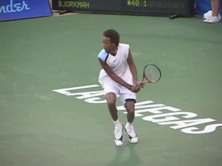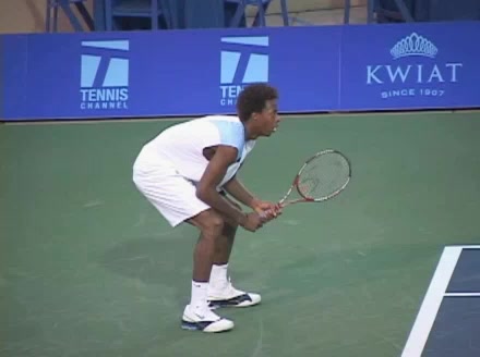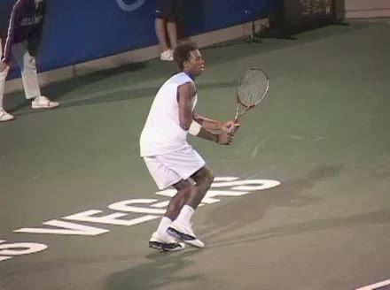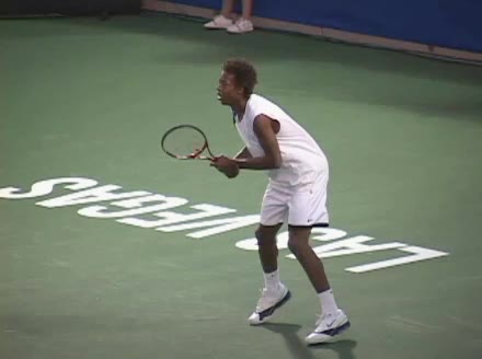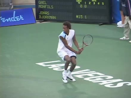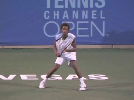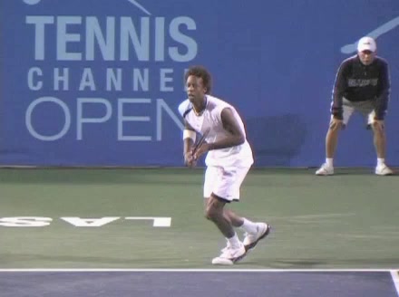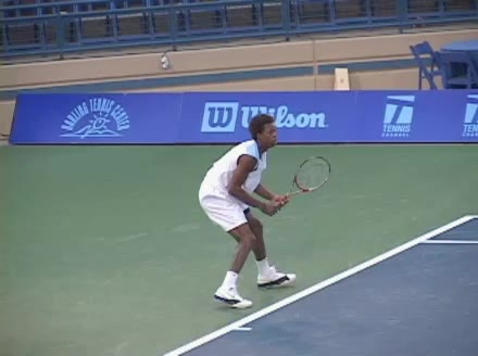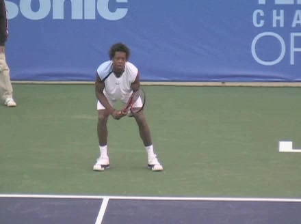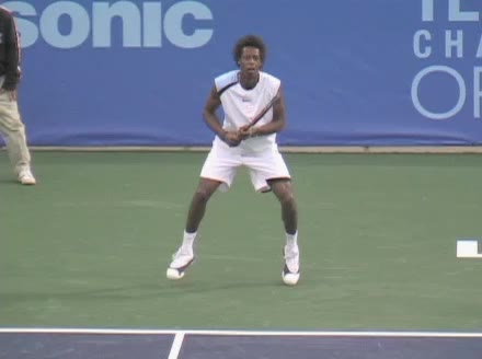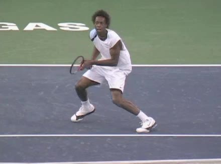 Gael Monfils's backhand from the center of the court, filmed from a court-level side angle. His feet plant in a solid neutral stance before contact, with a small adjustment step from his right foot that sets his weight transfer cleanly into the stroke.