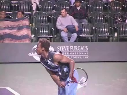 Gael Monfils's second serve from the Ad side, filmed from the side. From this angle you can see his shoulders rotate well past perpendicular to the baseline during the trophy phase before the trunk uncoils in sequence ahead of the arm swing.