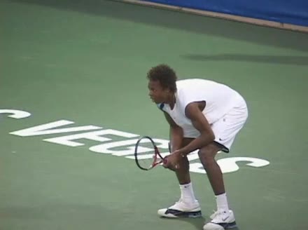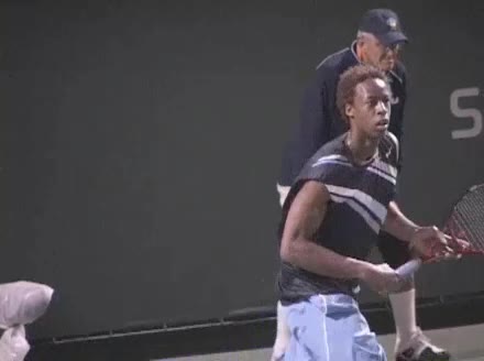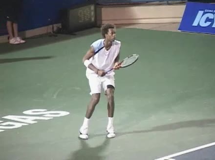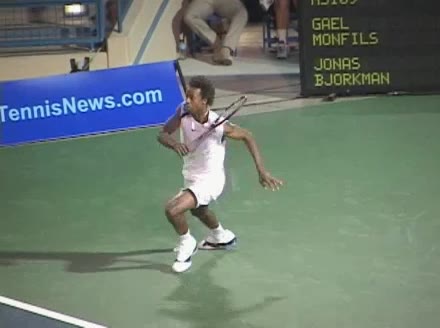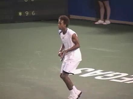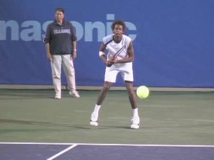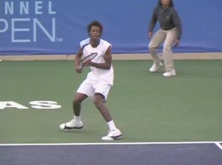 Gael Monfils's backhand from the center of the court, filmed from a court-level front angle. The video clearly shows his two-handed contact point slightly in front of his body with a closed racket face and a steep upward swing path through the ball.