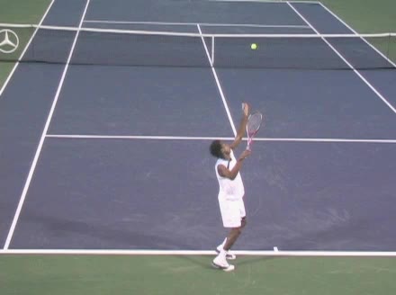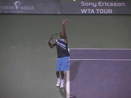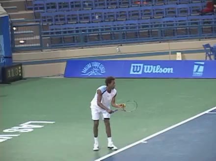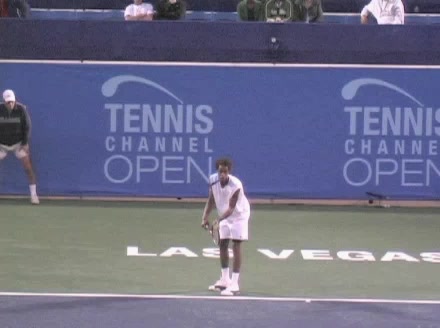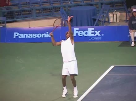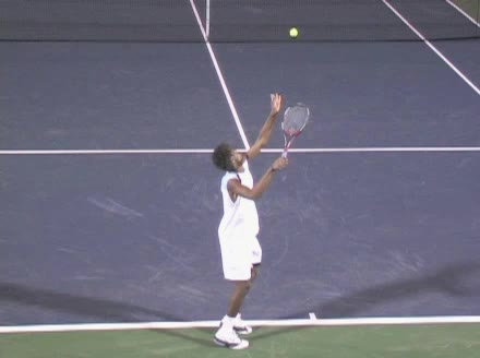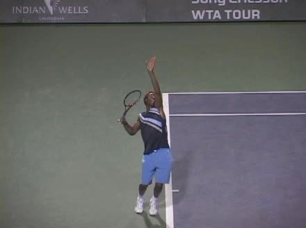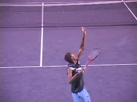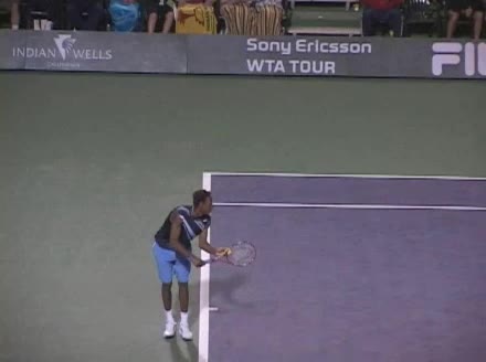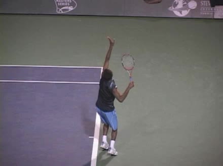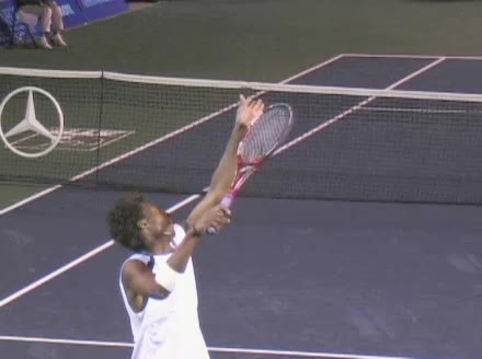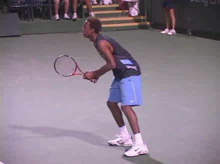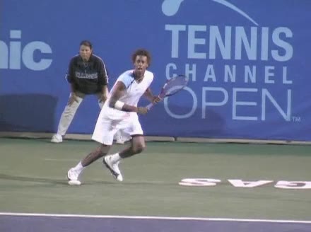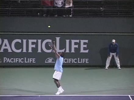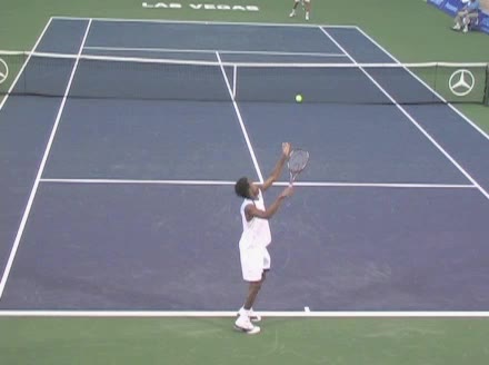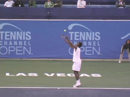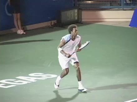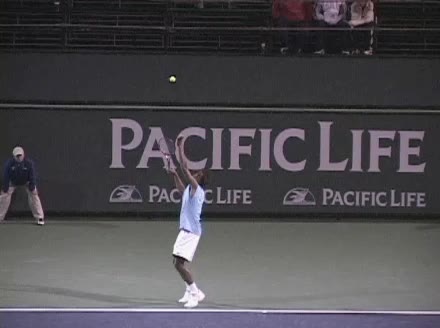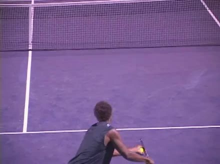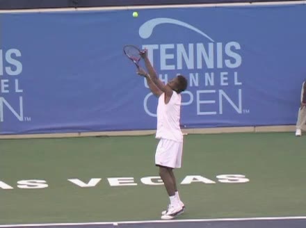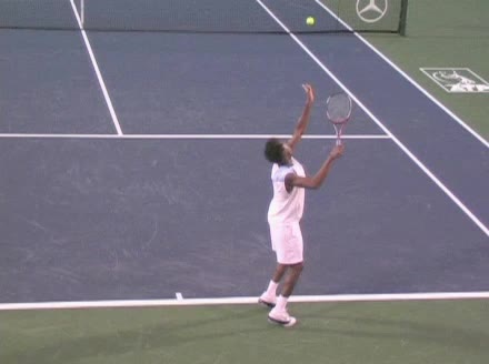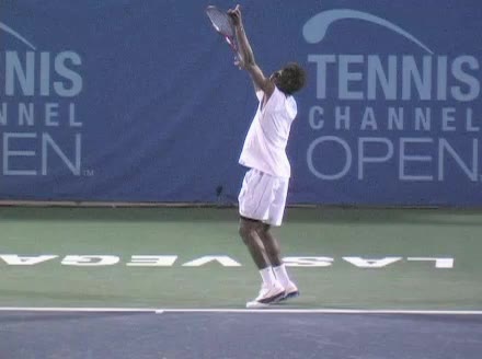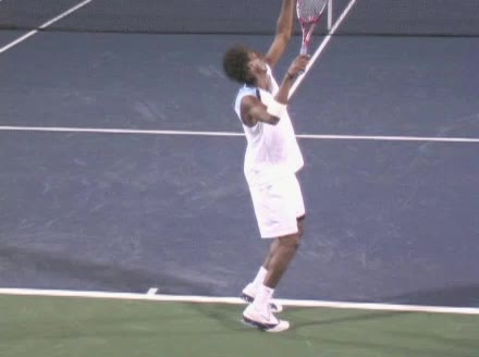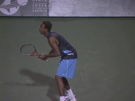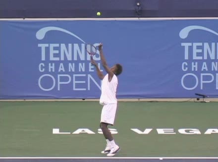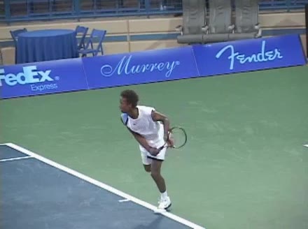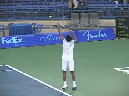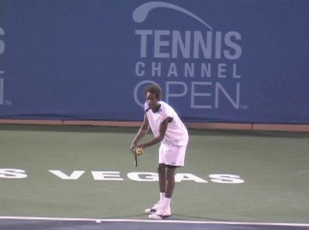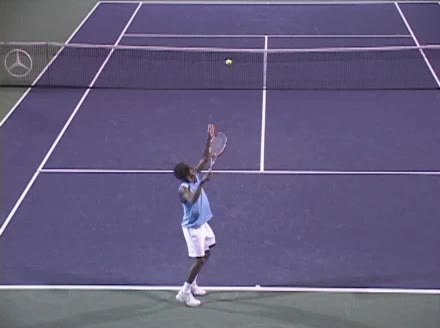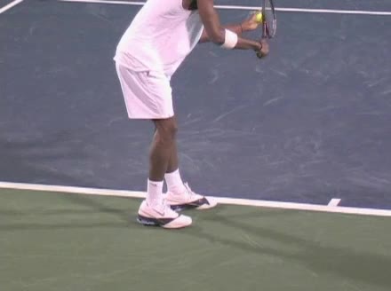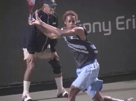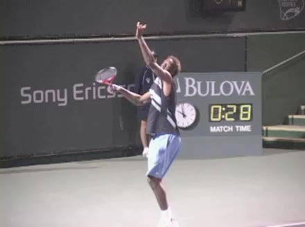 Gael Monfils's second serve from the Ad side, filmed from the side. After contact he drives his weight into the court and finishes with his hitting arm relaxed across his body while his non-hitting hand drops quickly into a ready position for the next shot.