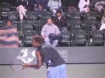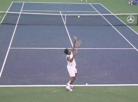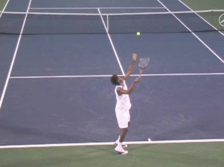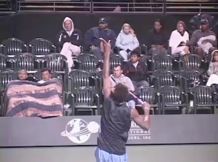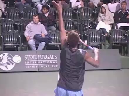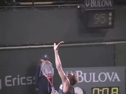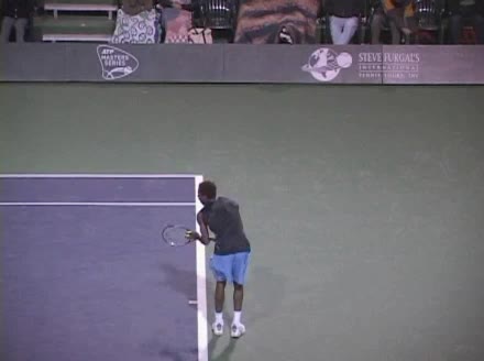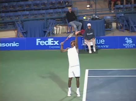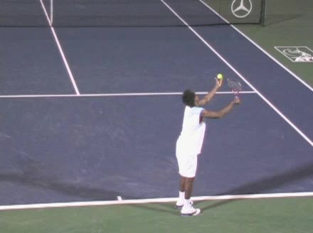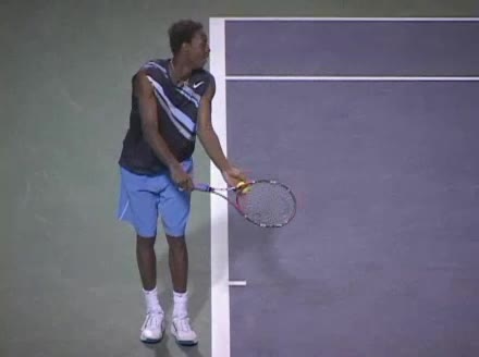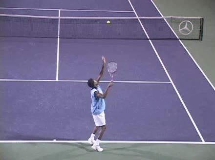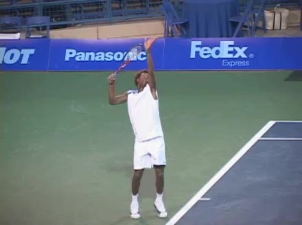 Gael Monfils's second serve from the Ad side, filmed from the side. From this angle, you can clearly see his continental grip stay firm as his wrist pronates aggressively through contact to add spin.