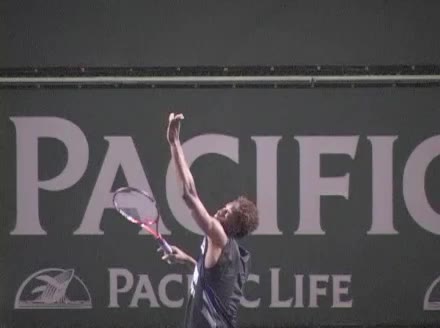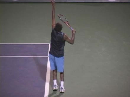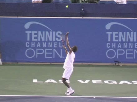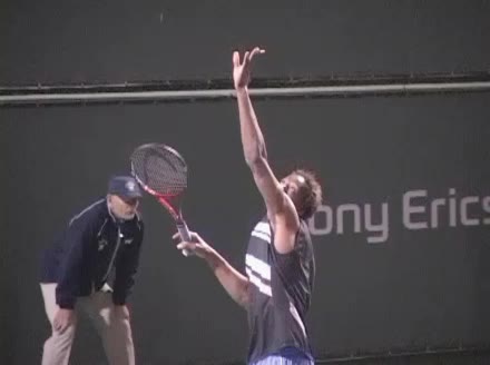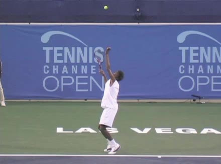 Gael Monfils's second serve from the deuce side, filmed from a rear angle. From this view you can clearly see his continental grip stay relaxed as his wrist pronates aggressively through contact, with the racquet head snapping up and across the ball to impart spin.