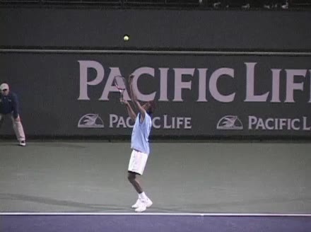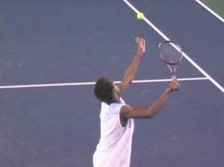 Gael Monfils's second serve from the deuce side, filmed from the side. From this angle you can clearly see his continental grip stay firm as his wrist pronates aggressively through contact to add spin and control.