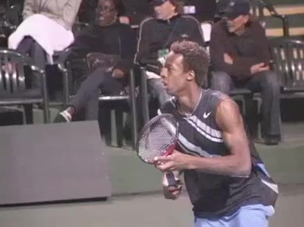 Gael Monfils's backhand while moving back from a neutral position, filmed from a court-level side angle. From this view, his two-handed grip stays firm with a noticeable laid-back wrist position on the racquet hand that straightens into contact.