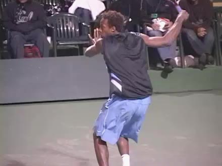 Gael Monfils's wide backhand from a closed stance, filmed from a court-level front angle. His shoulders rotate as a single unit with the trunk into a deep coil, then uncoil in sequence from hips to shoulders, making the degree of upper-body rotation and timing of the release easy to compare between preparation and contact.