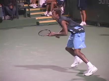 Gael Monfils's forehand approach shot from a neutral court position, filmed from the rear. His hips stay relatively closed through the loading phase with a deep knee bend, then drive forward explosively off the outside leg as he moves into the court toward the eventual overhead.