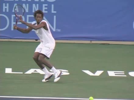 Gael Monfils's backhand while moving back from a neutral position, filmed from a court_level front angle. His racket face stays relatively square through contact at about waist height, with the top hand driving the racket head forward on a slightly upward path for added racket head speed.