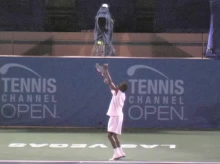 Gael Monfils's second serve from the deuce side, filmed from a rear angle. His continental grip is clearly visible, and the rear view makes it easy to see the pronounced wrist pronation through contact as his hitting hand rotates outward after impact.