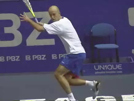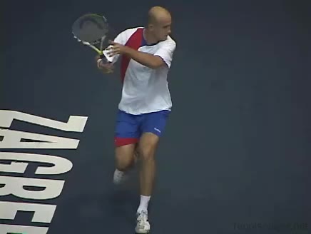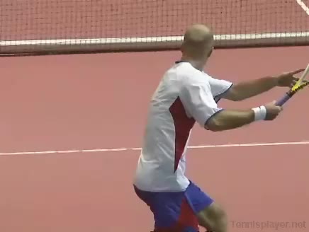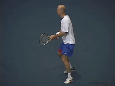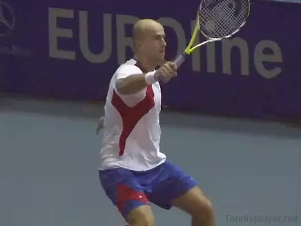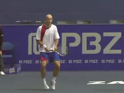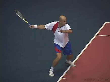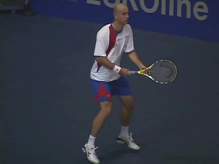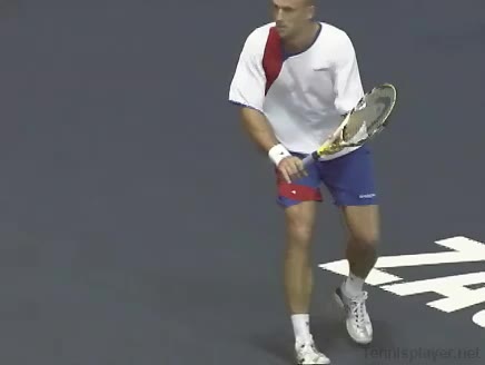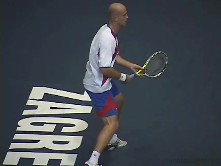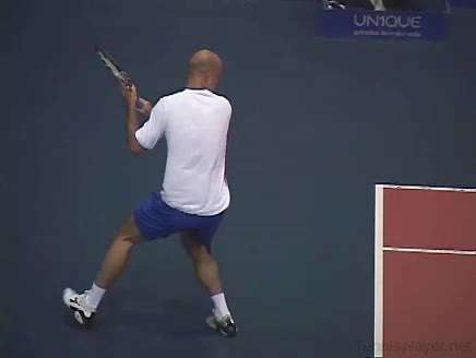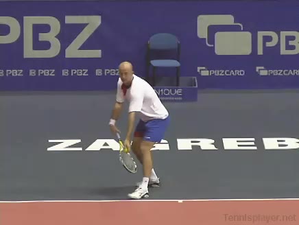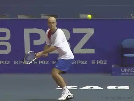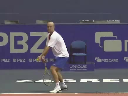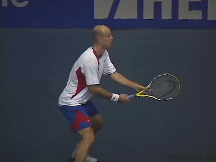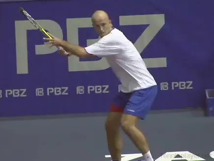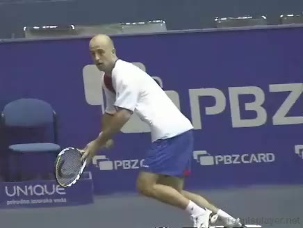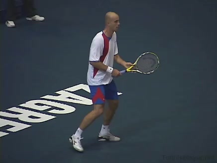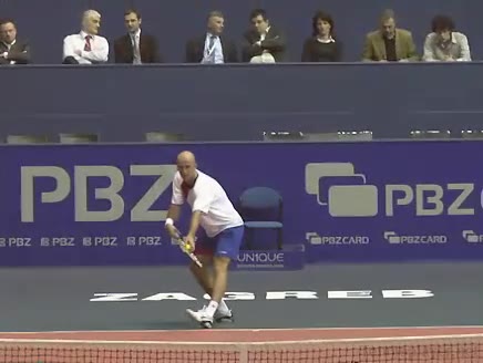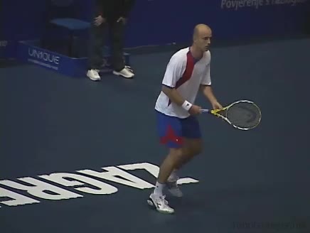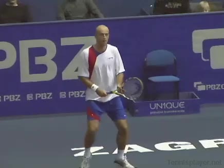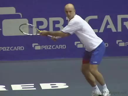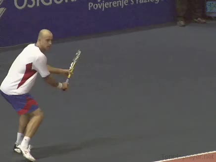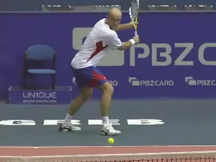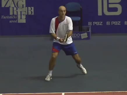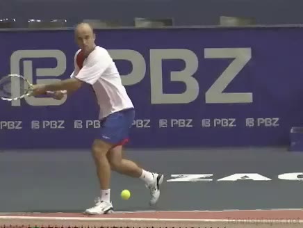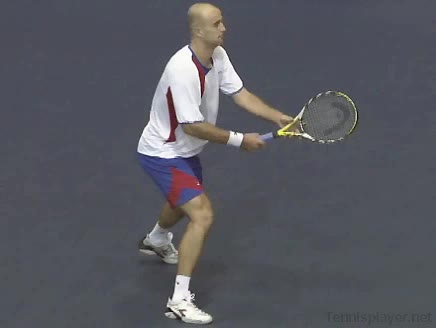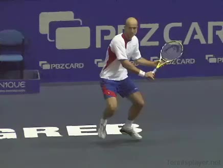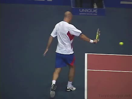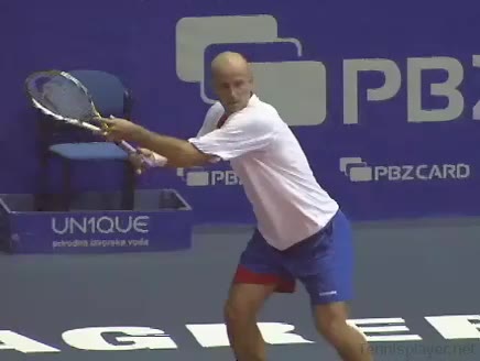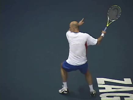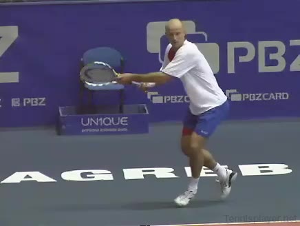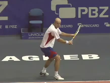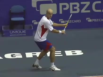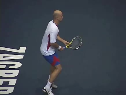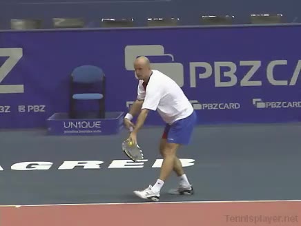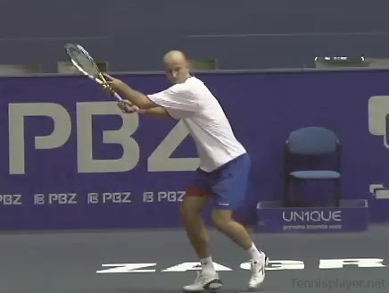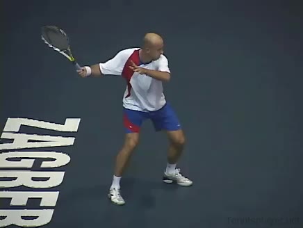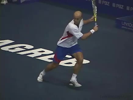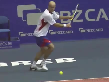 Ivan Ljubicic's wide backhand from the front. His shoulders rotate as a single unit with the trunk on the unit turn, then uncoil together through contact with minimal independent shoulder whip, making the trunk rotation the primary driver of the stroke.