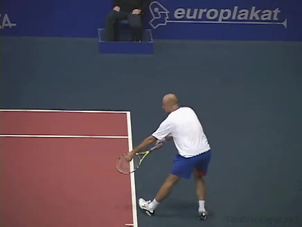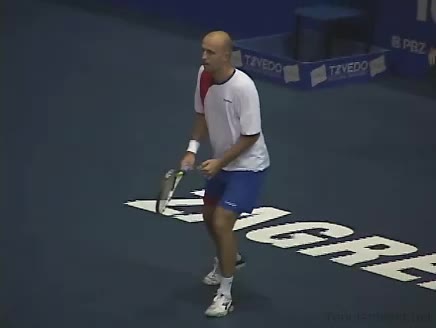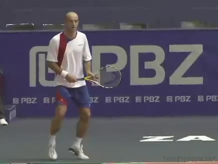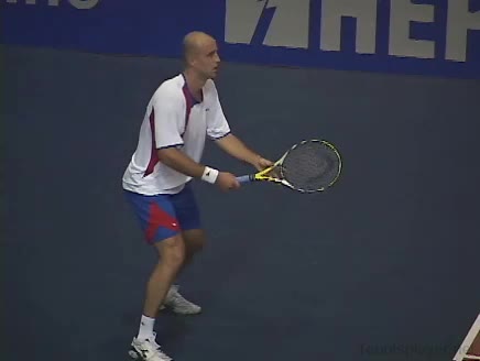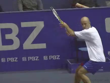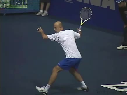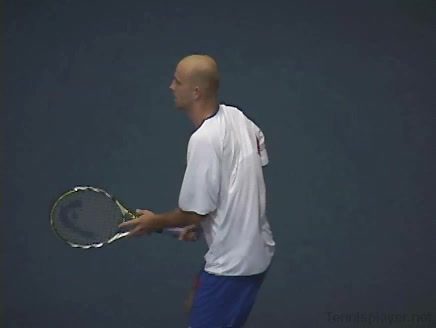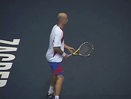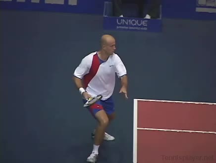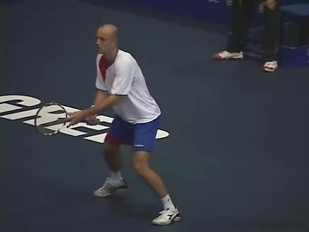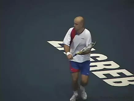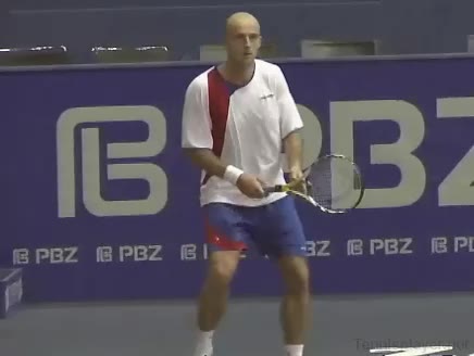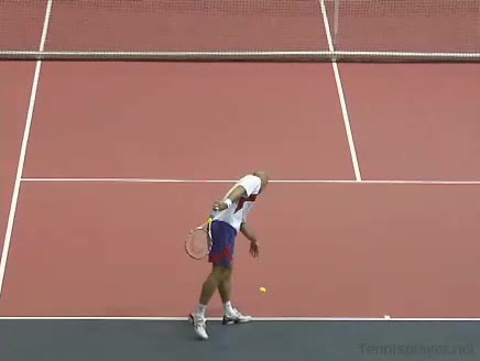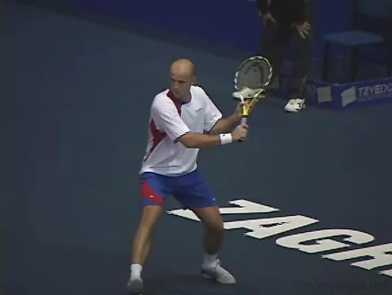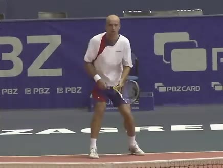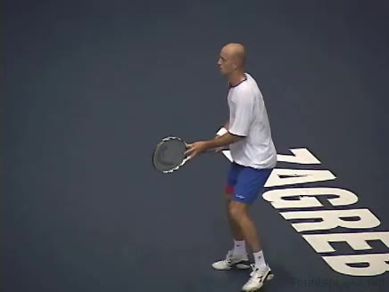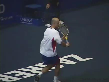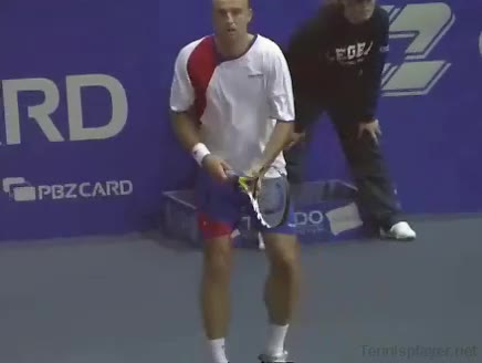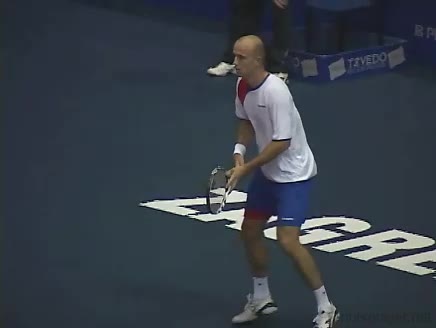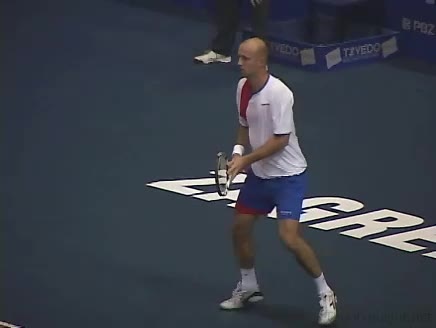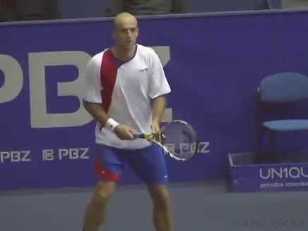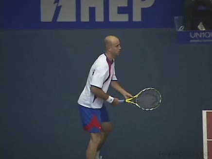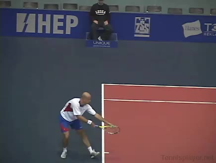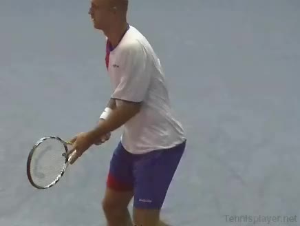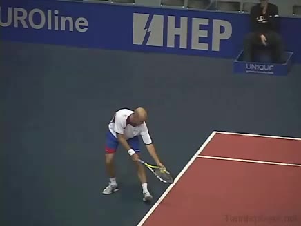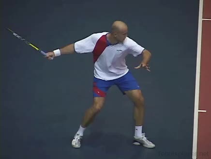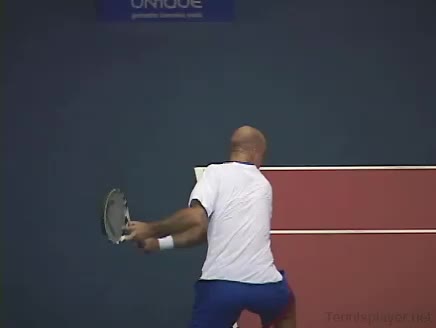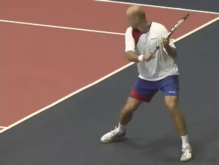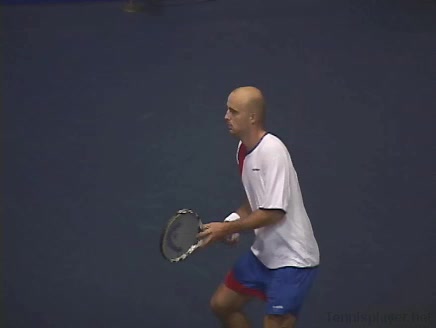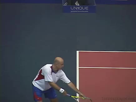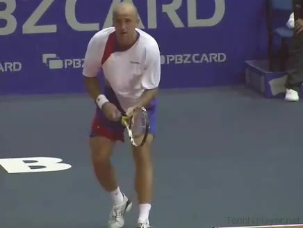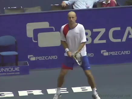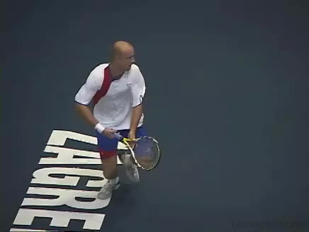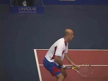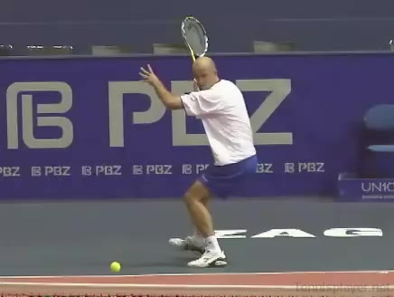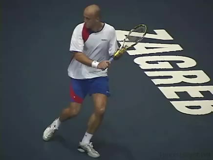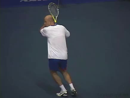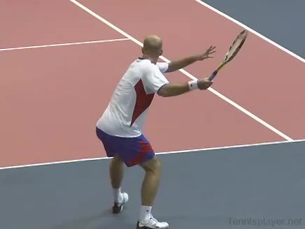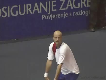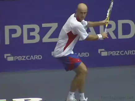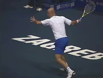 Ivan Ljubicic's wide backhand from the front. His shoulders rotate as a single unit with the trunk on the unit turn, then uncoil together through contact with minimal independent shoulder whip, making the trunk rotation the primary driver of the stroke.